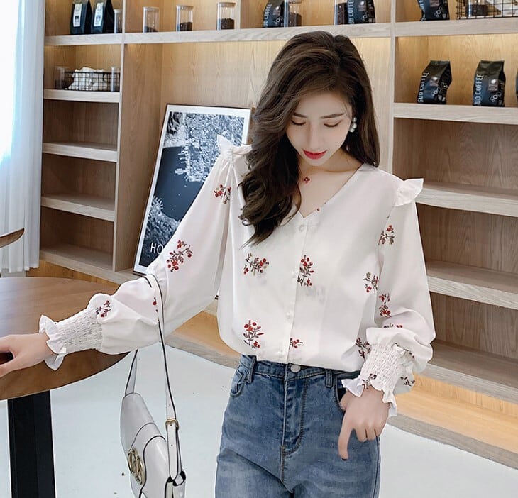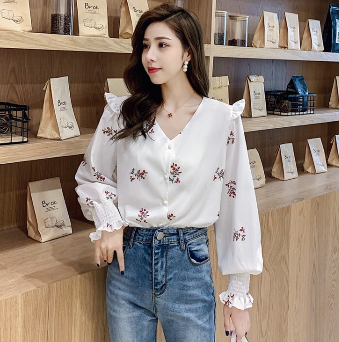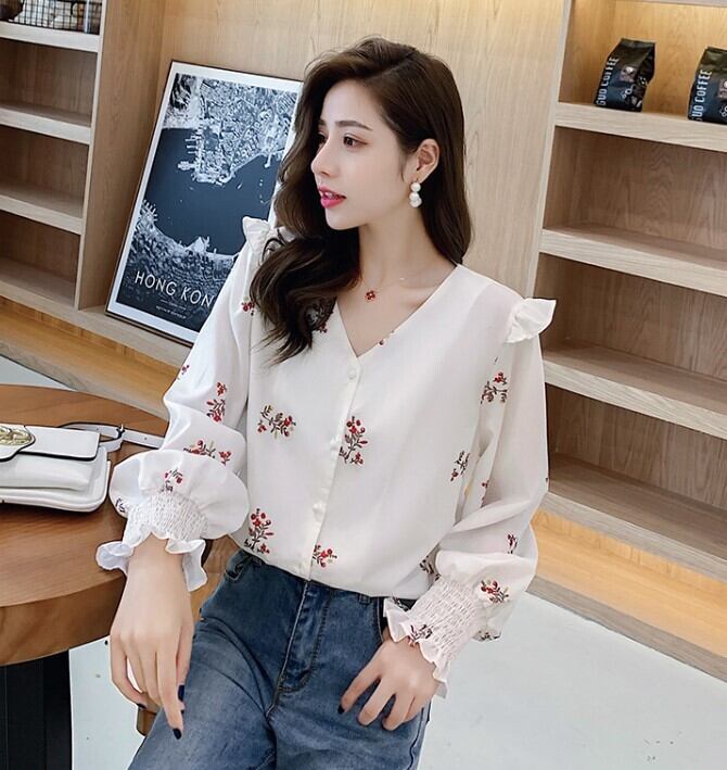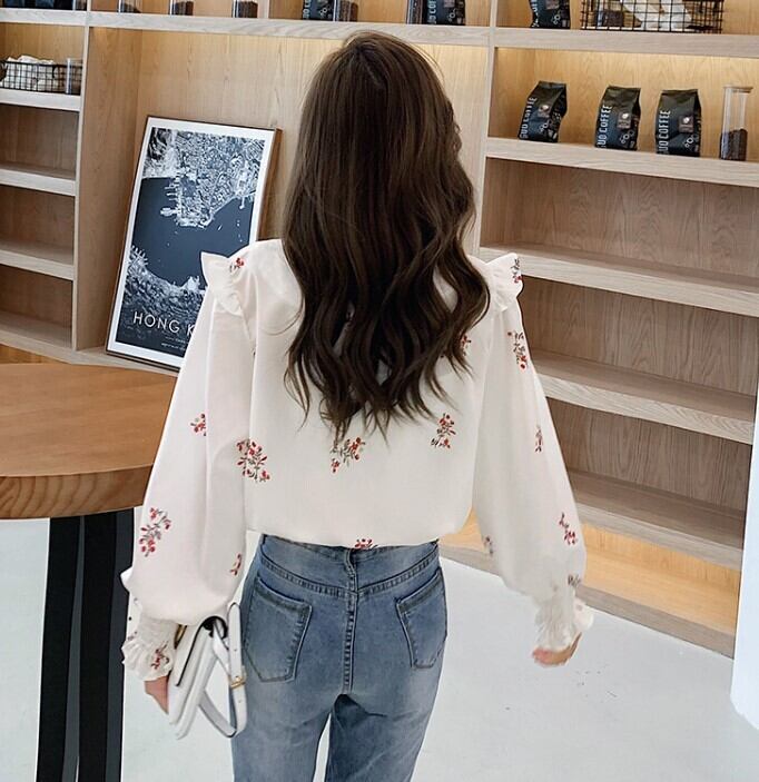 ブラウス シャツ レディース 春秋 長袖 フリル 花柄 Vネック フェミニン ガーリー オフィス レトロ 清楚 ab2456