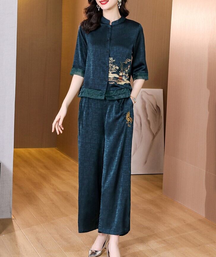 セットアップ ツーピース レディース レトロ 大きいサイズ 刺繍 民族風 五分袖 シック ワイドパンツ 春秋 ハイネック プチプラ ab2457