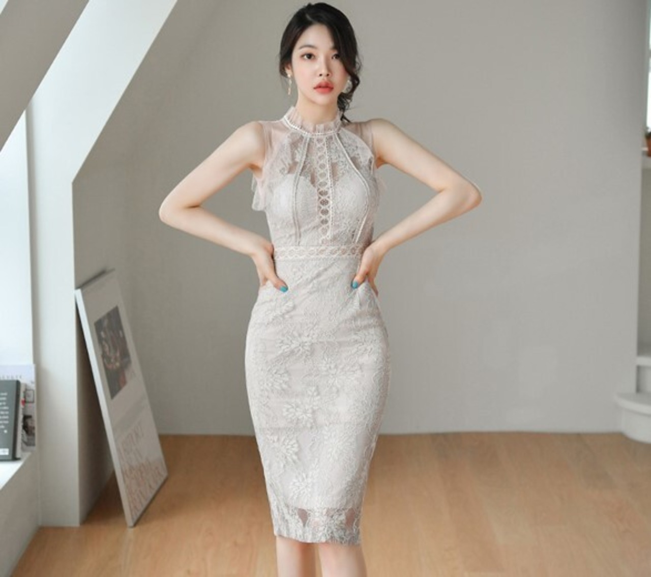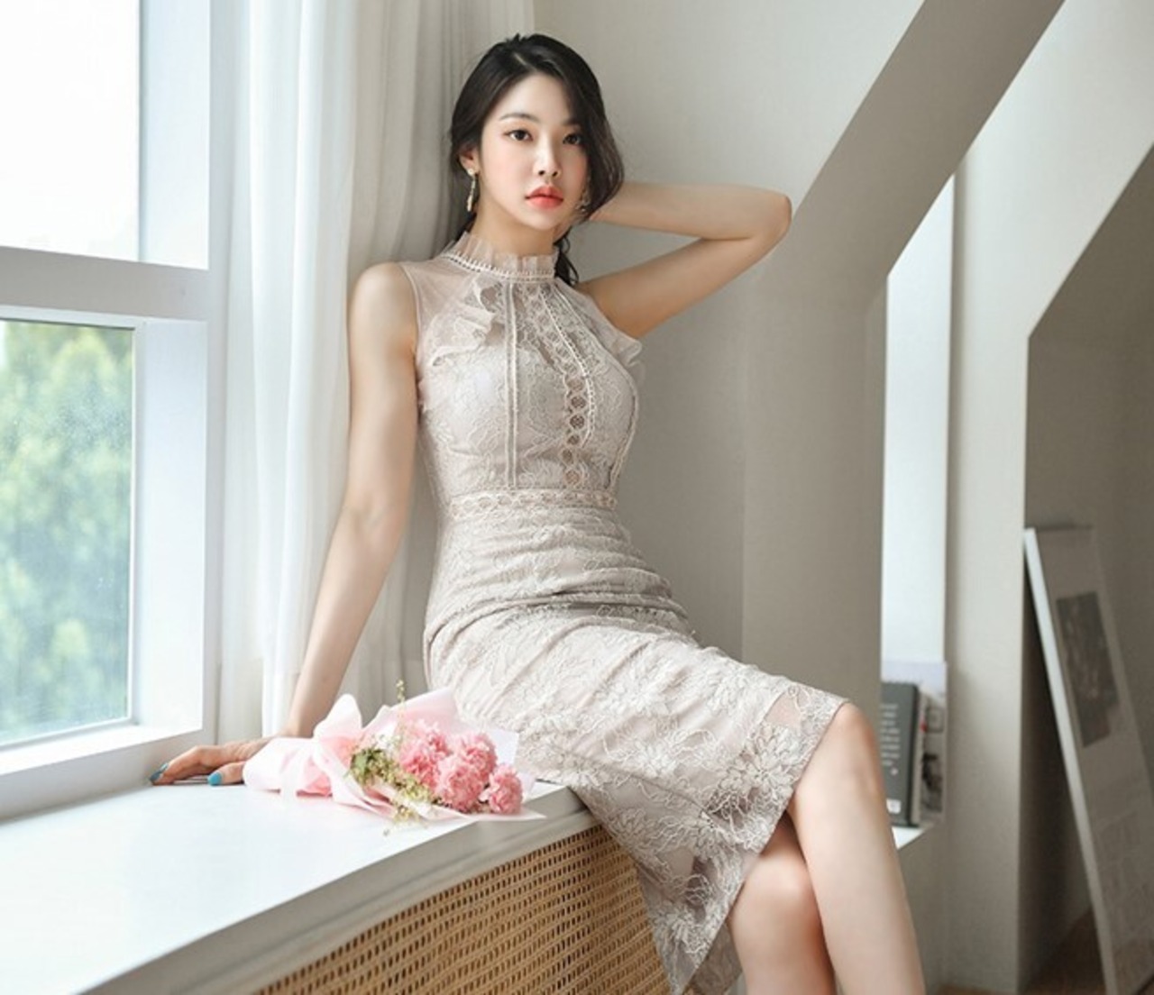ドレス レースドレス ワンピース ワンピースドレス レース レディース ハイネック ひざ丈 ノースリーブ パーティー 二次会 お呼ばれ ab2464