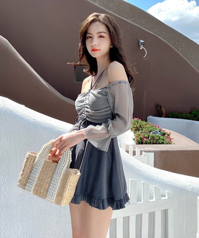 水着 ワンピース水着 レディース 2WAY オフショルダー ドッキング フレアスリーブ ガーリー 海 プール フリル ab2471