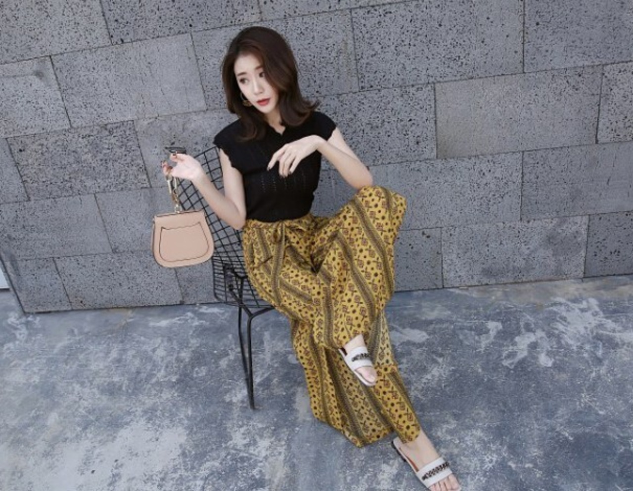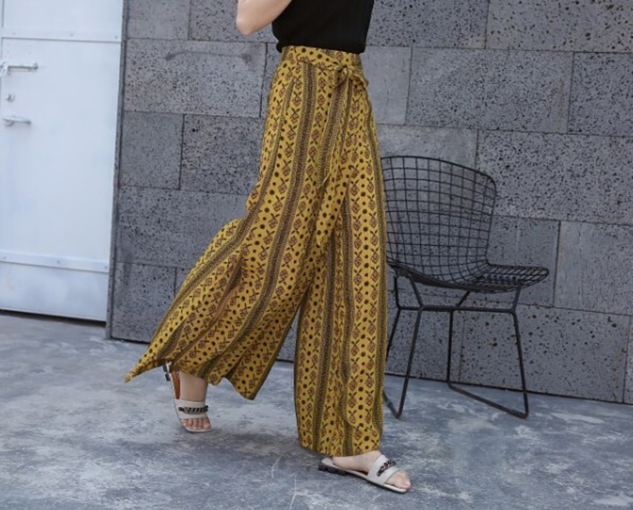 ワイドパンツ レディース ズボン ロング丈 ボヘミアン ワイドレッグ エスニック スリット ハイウエスト ダンス リボン カジュアル ab2473