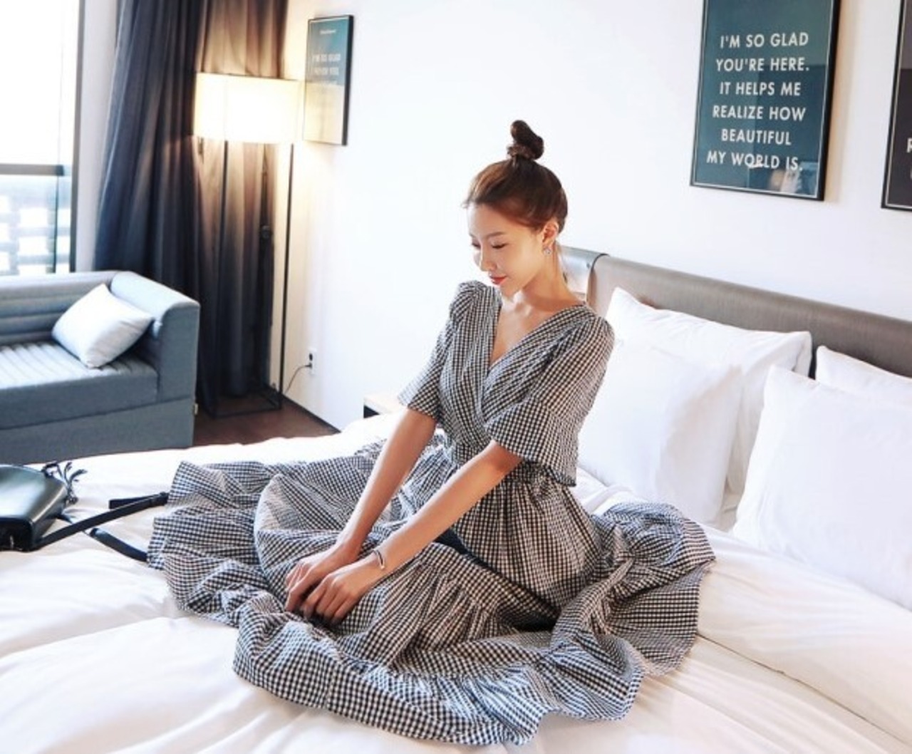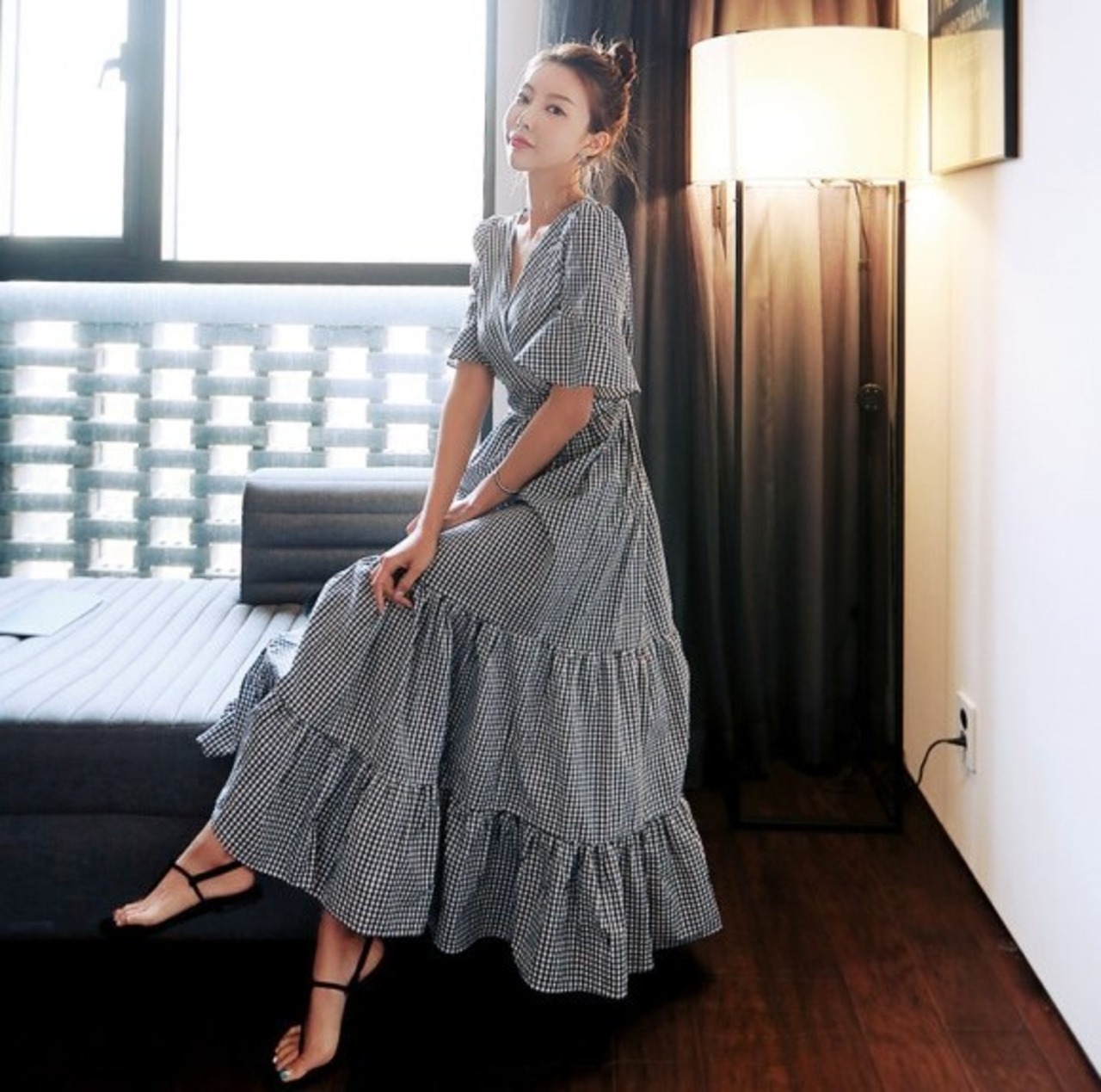 ワンピース 春夏 レディース 半袖 ロング丈 チェック 格子柄 Vネック クロス 体型カバー ふんわり フリル キュート ガーリー ab2477