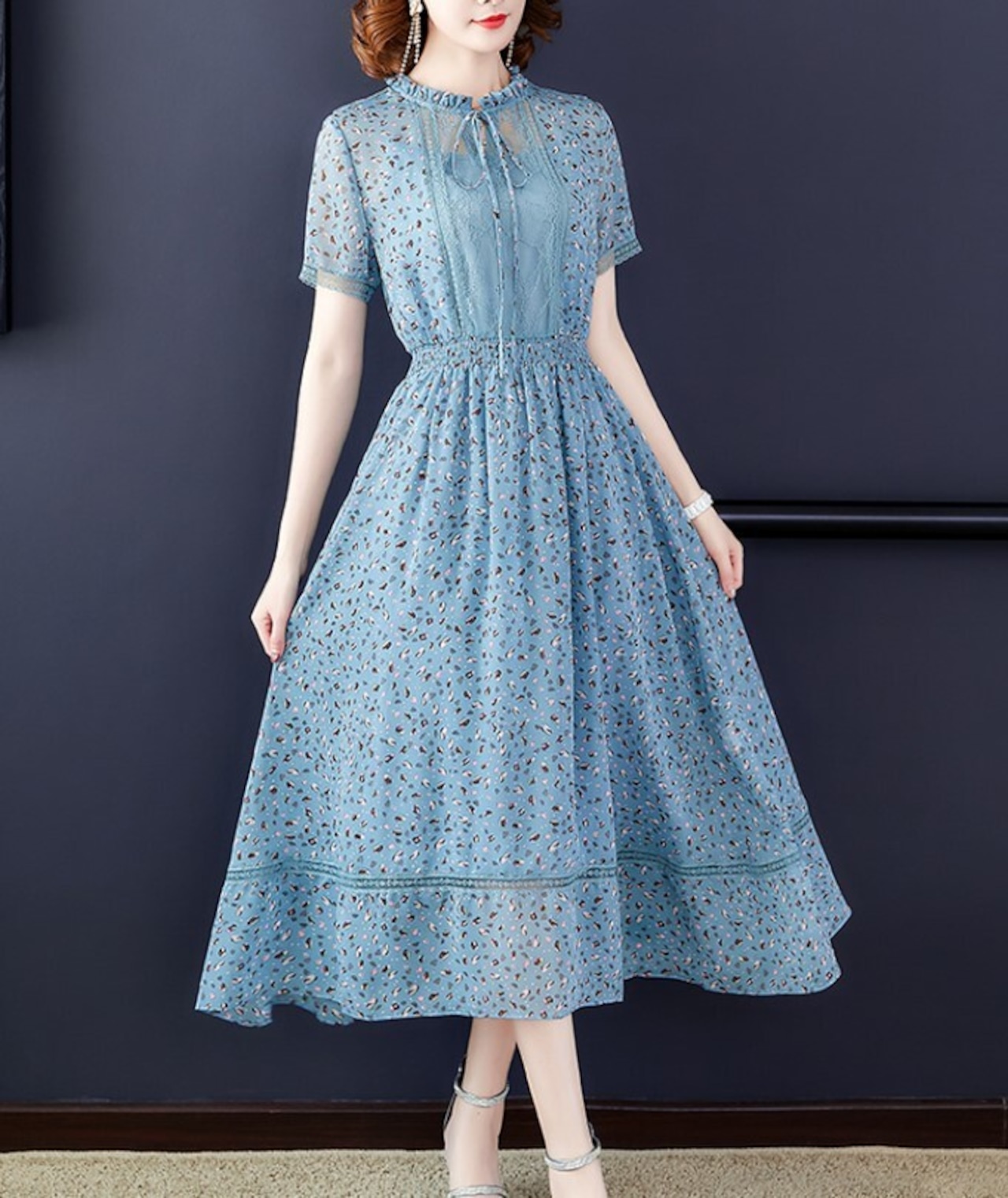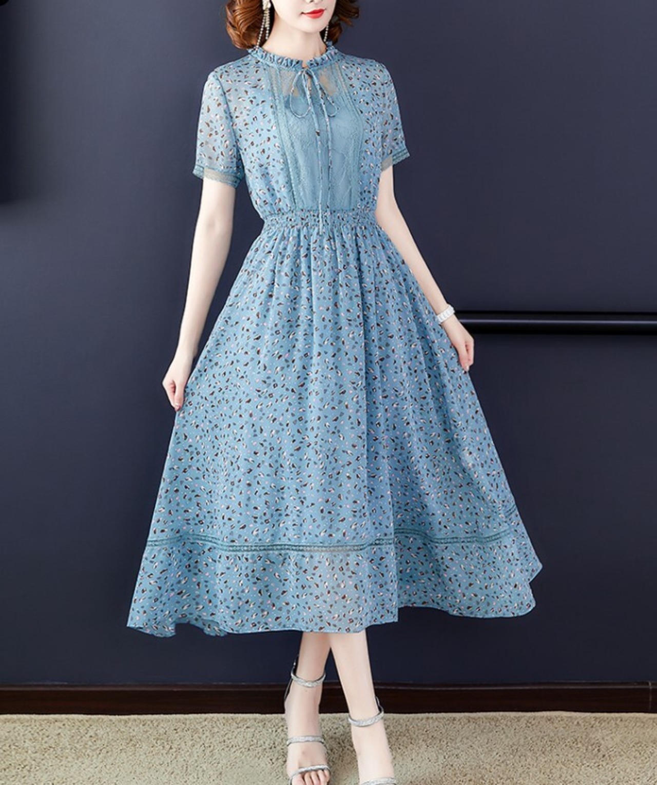 ワンピース レースワンピ ロング丈 春夏 レディース ひざ丈 レース 半袖 リボン フリル ラウンドネック エレガント Aライン シースルー ab2479