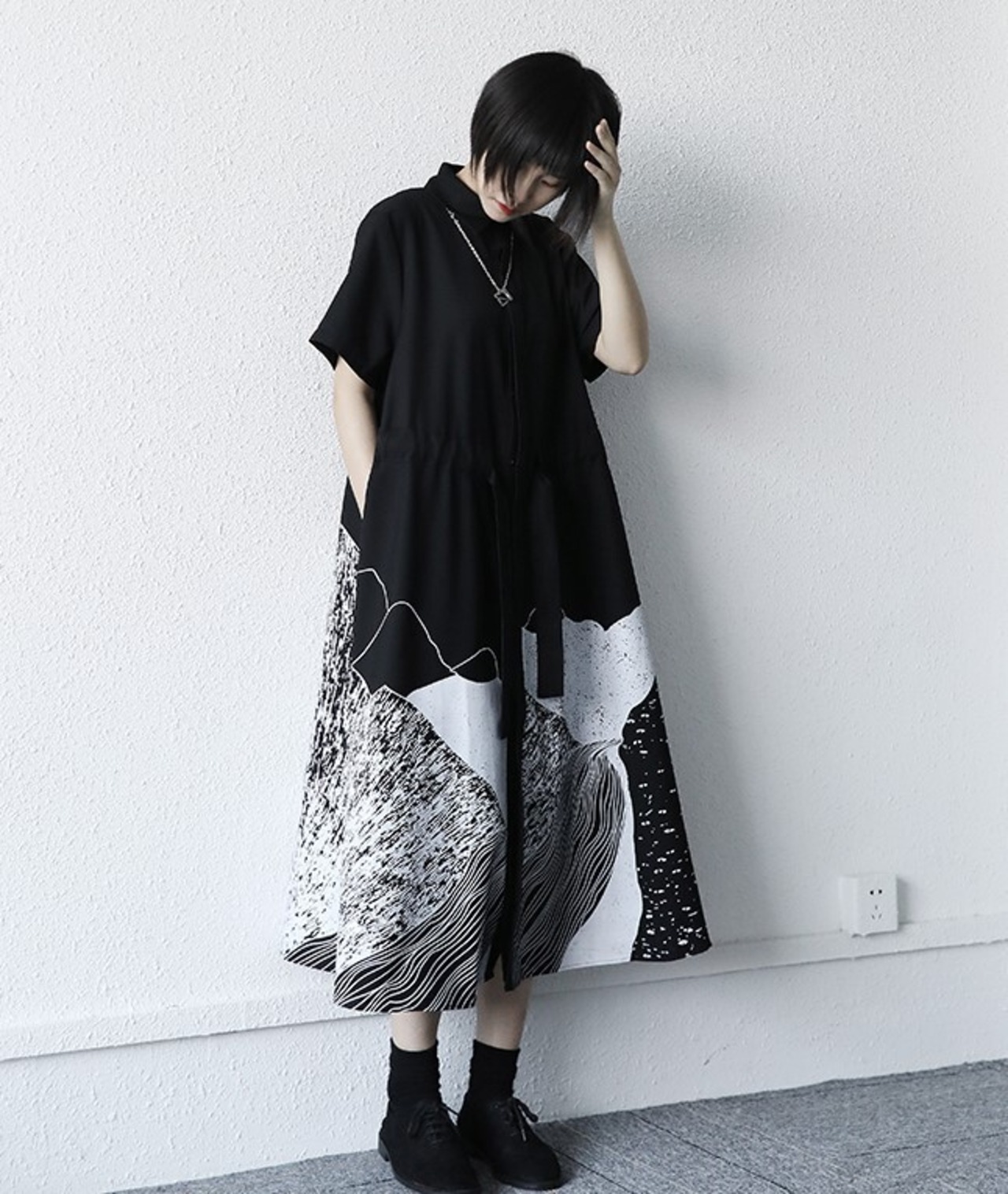 ワンピース ゆったり レディース 春夏 ロング丈 大きいサイズ シャツワンピ 幾何学 レトロ 半袖 ハイウエスト ガーリー ブラック ab2490