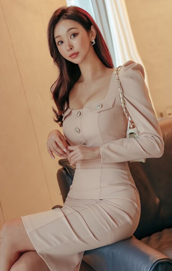 ワンピース レディース 春秋 長袖 タイトワンピ スクエアネック セクシー ひざ丈 ハイウエスト お呼ばれ デート 無地 ボタン ab2499