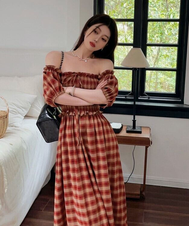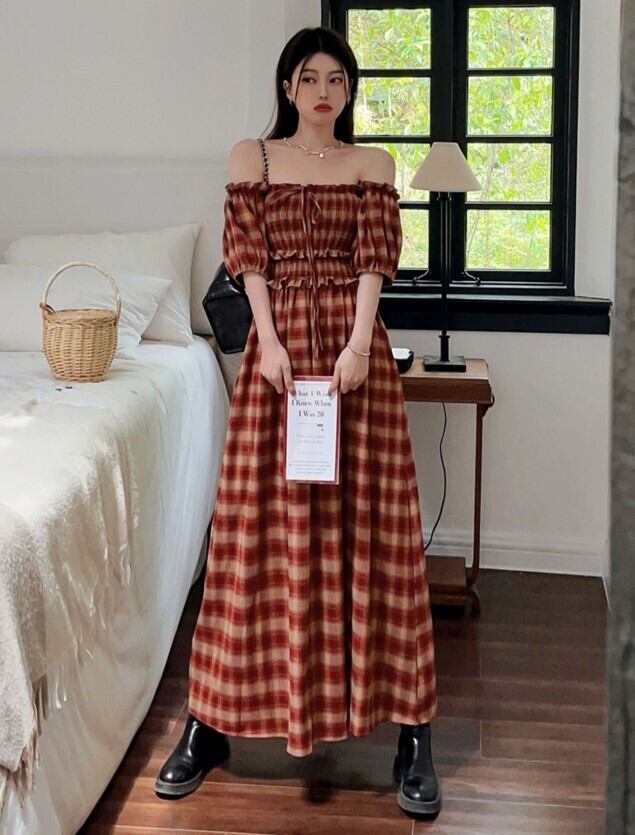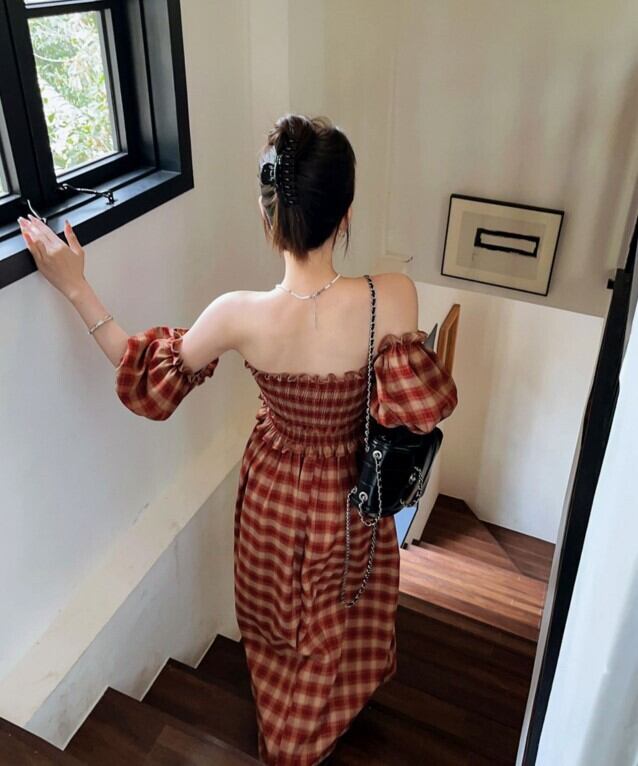 ワンピース ロング丈 春夏 レディース チェック オフショルダー 夏ワンピ Aライン バックオープン セクシー 格子柄 ab2506