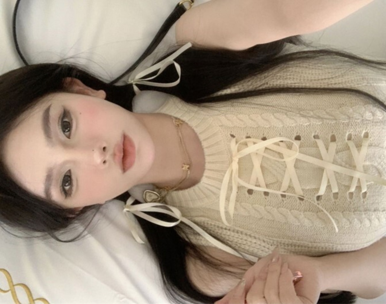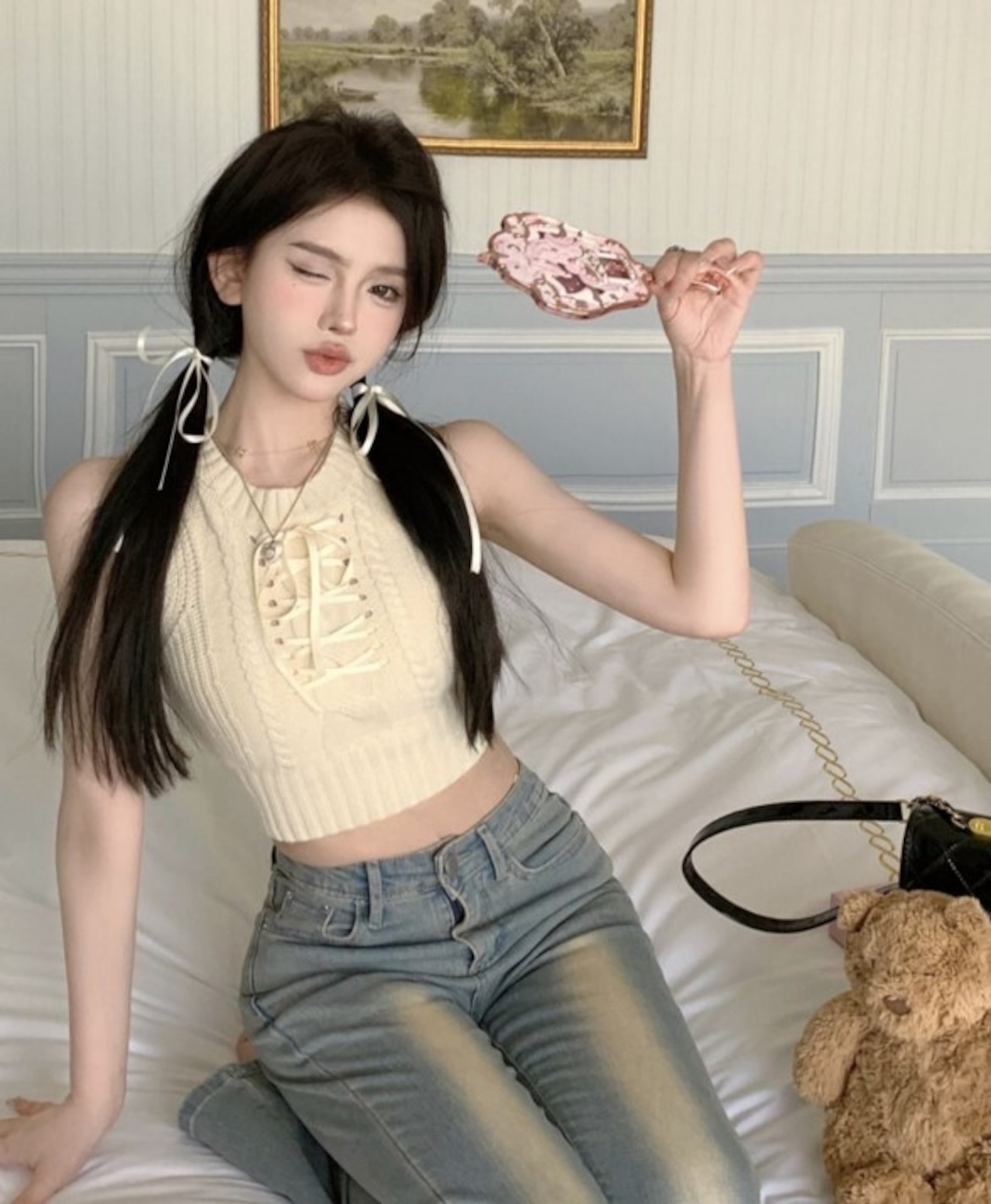 トップス サマーニット レディース ノースリーブ プルオーバー 春夏 リボン ラウンドネック ガーリー フェミニン ショート丈 ベージュ ab2510