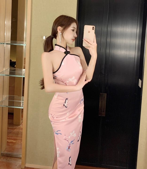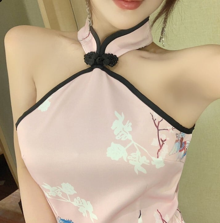 チャイナドレス チャイナワンピース レディース ひざ丈 ホルターネック チャイナ ワンピース セクシー 鶴 パーティー 結婚式 お呼ばれ ノースリーブ ab2527