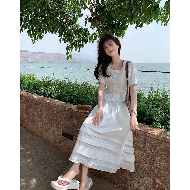 上下セット セットアップ ブラウス スカート フリル 半袖 パフスリーブ スクエアネック 前ボタン 無地 襟付き 夏 ママコーデ デート お出かけ MH3582