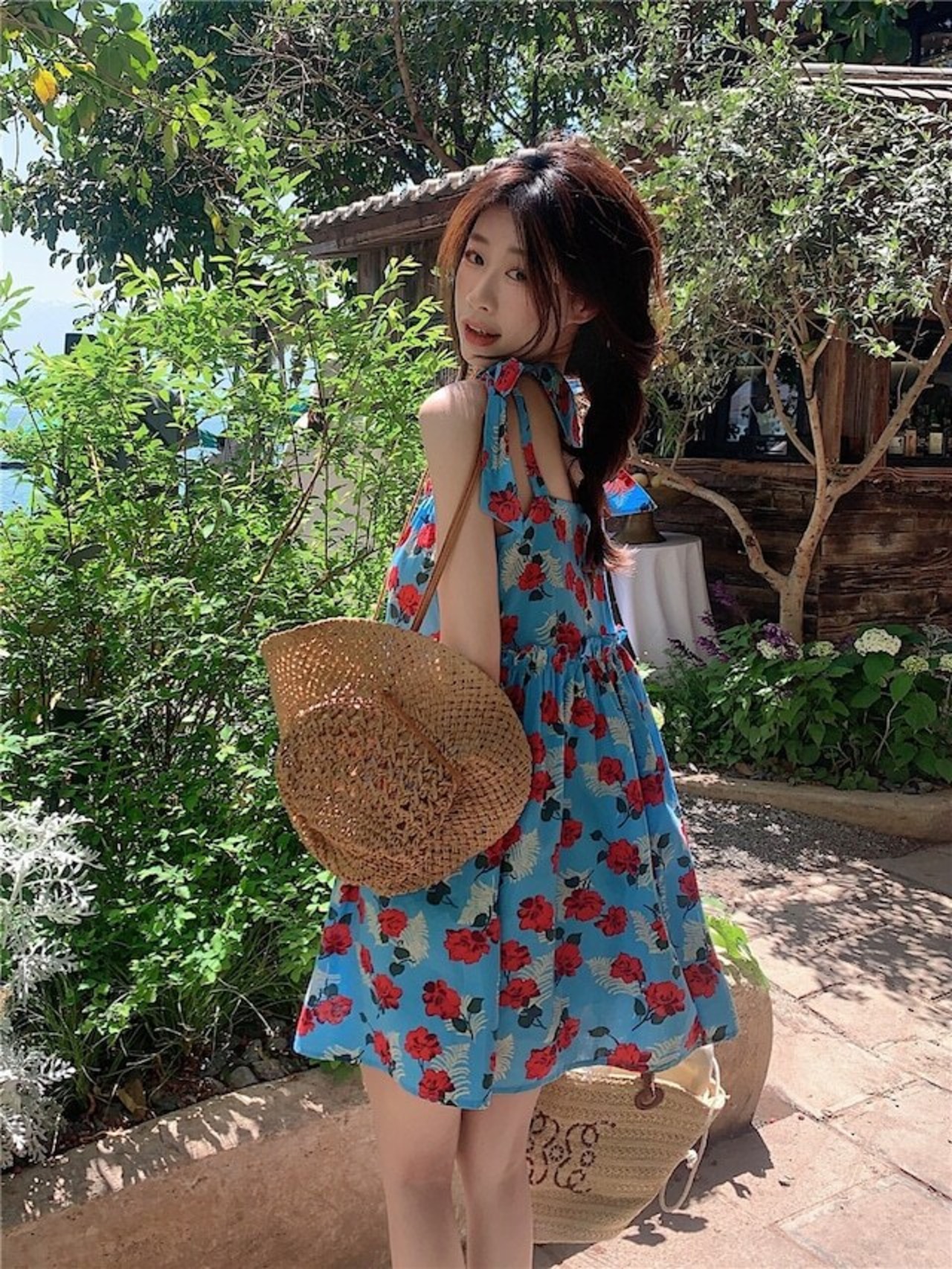 ミニ丈の花柄ワンピース。