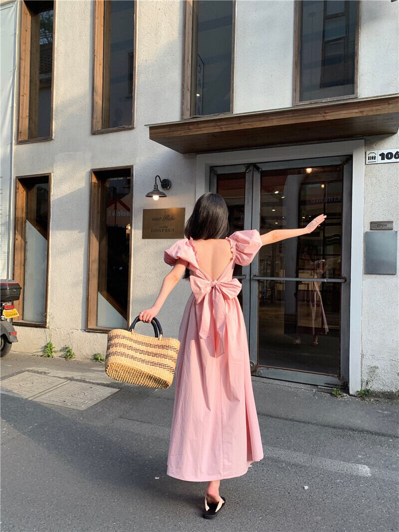 バックレースワンピース ワンピース バックレース 背中開き バックリボン パフスリーブ ロング丈 ピンク イエロー 夏 ママコーデ デート お出かけ MH3589