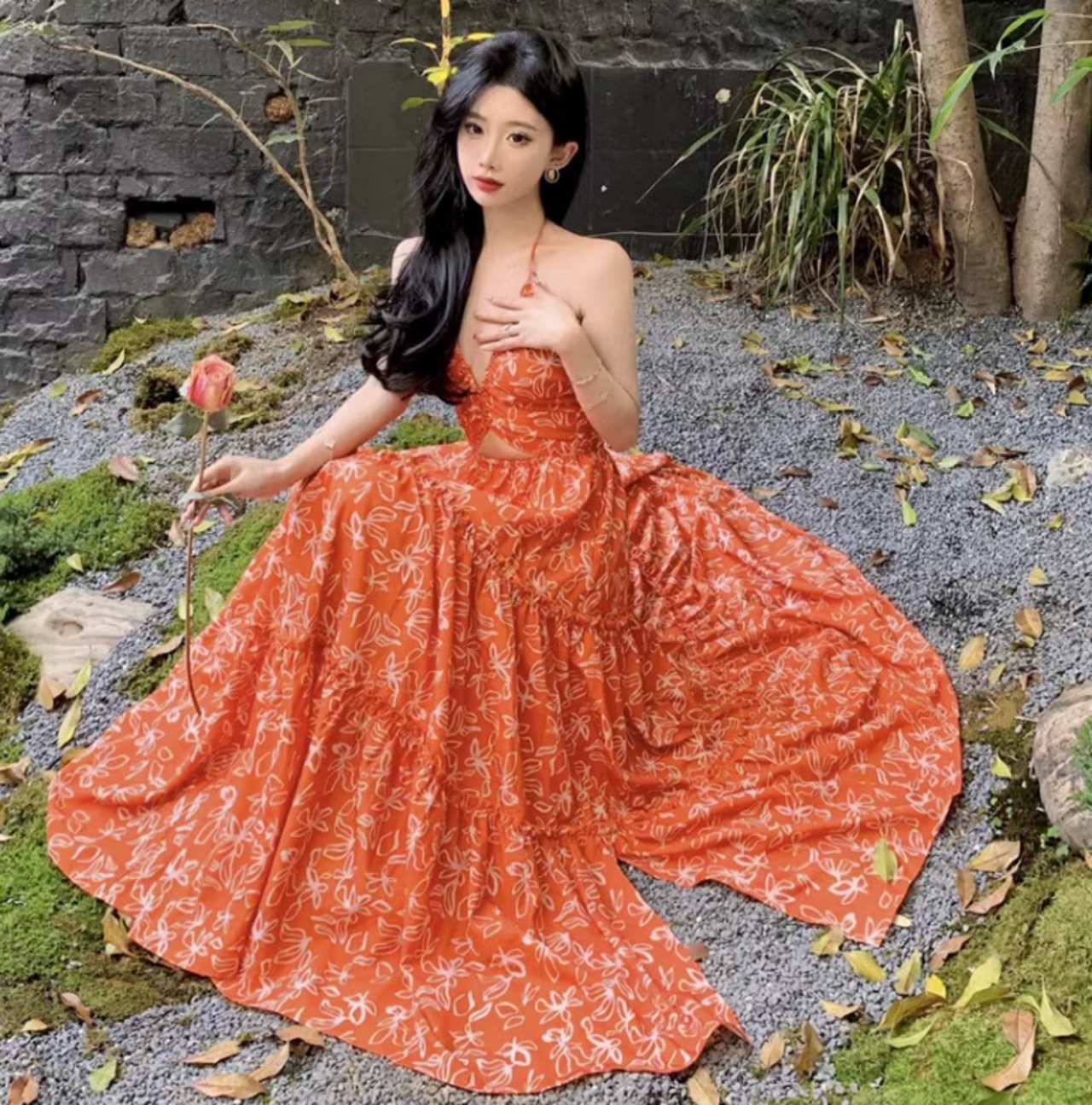 ワンピース キャミワンピース リゾートワンピース レディース ロング丈 ホルターネック バックオープン リゾート 旅行 ビーチ Vネック へそ出し ボタニカル 体型カバー セクシー ab2534