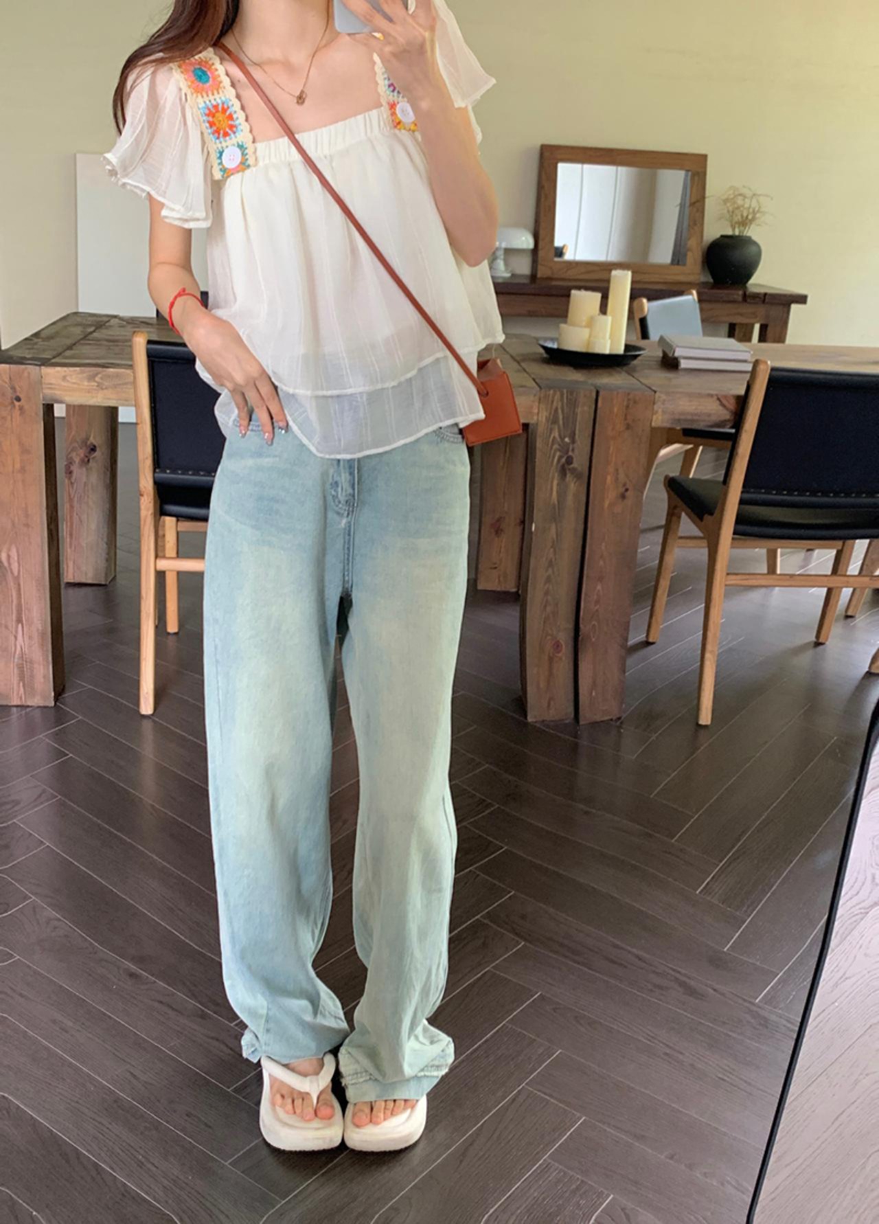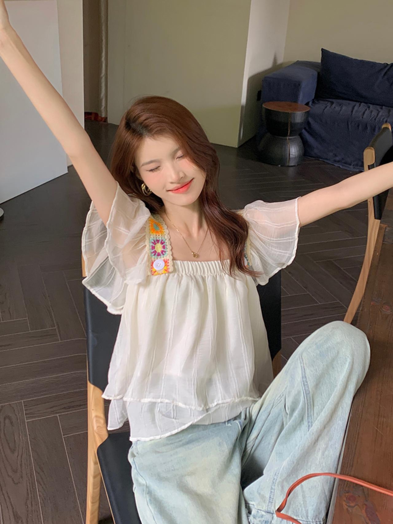 シフォンブラウス トップス シフォン 半袖 花刺繍 透け感 シアー シンプル 夏 ママコーデ デート お出かけ MH3617