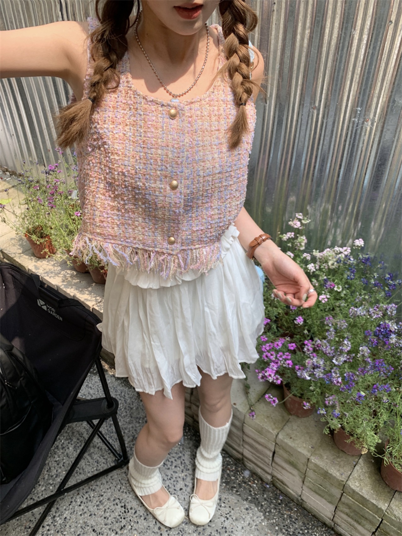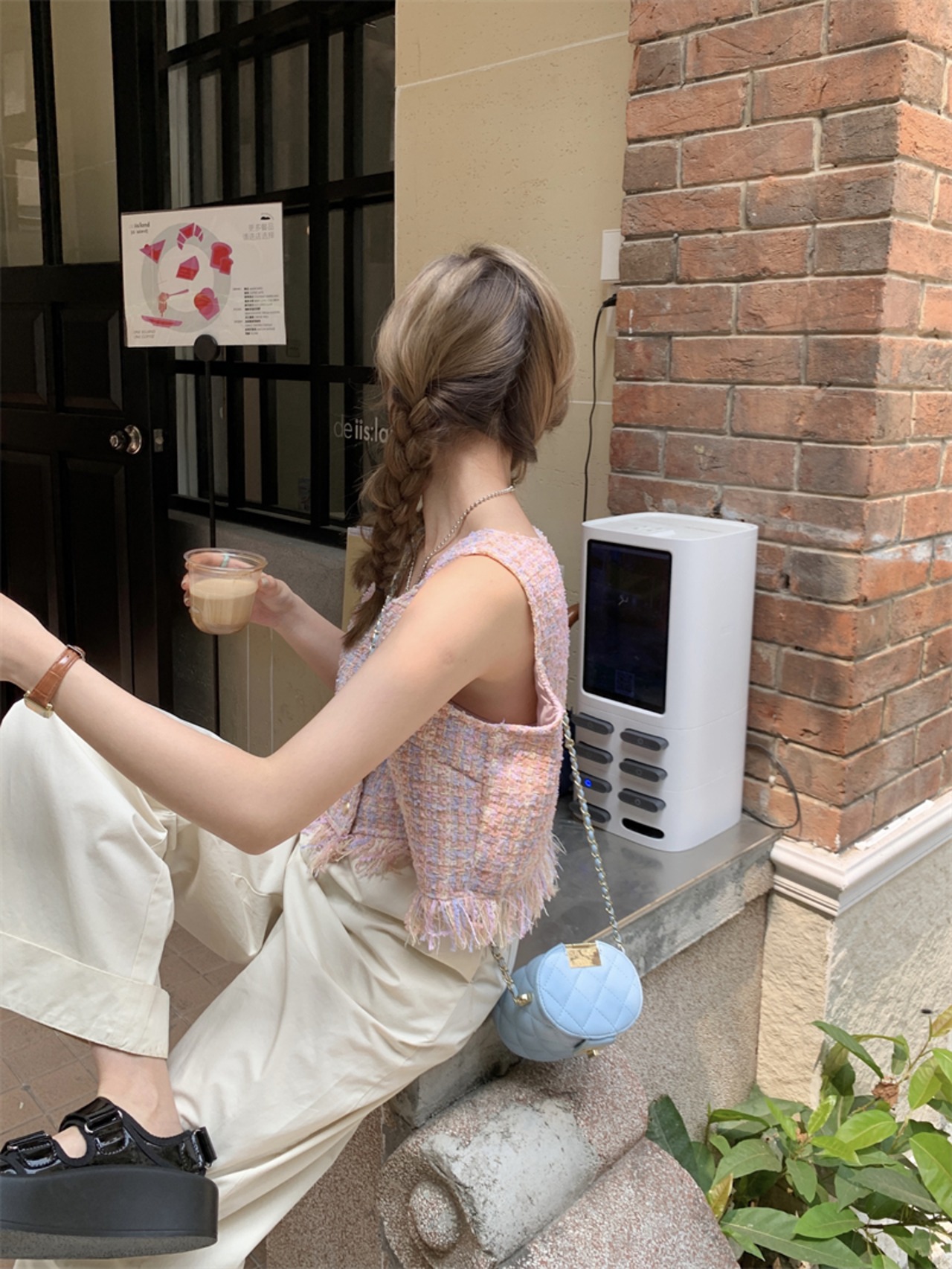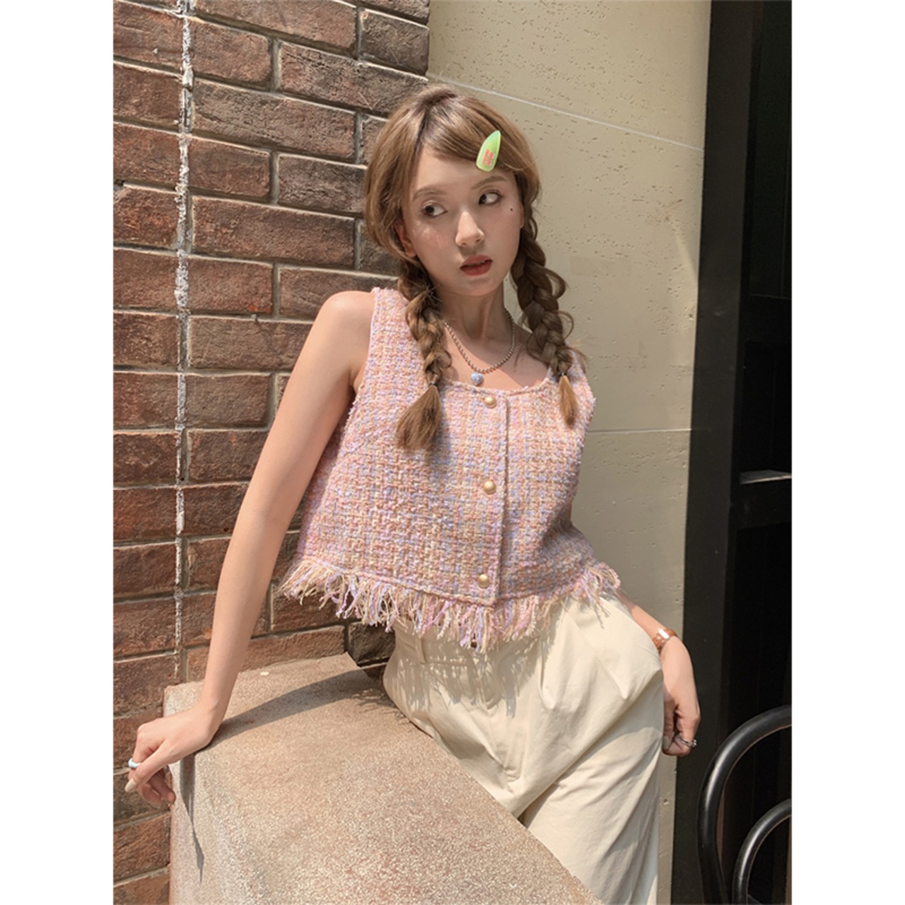 ツイードノースリーブ トップス ツイード ノースリーブ スクエアネック タッセル ショート丈 夏 レディース ママコーデ デート お出かけ MH3618