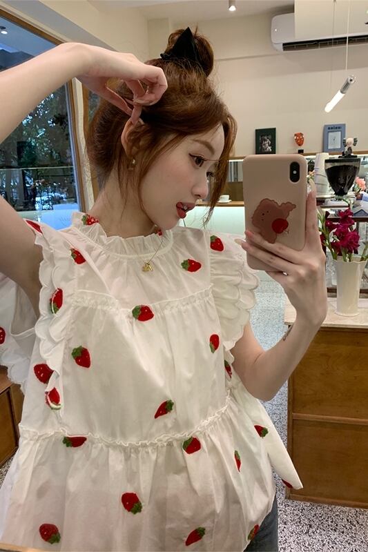 フリルブラウス トップス フリル いちご ストロベリー ホワイト ノースリーブ レディース 夏 ガーリー ママコーデ デート お出かけ MH3624