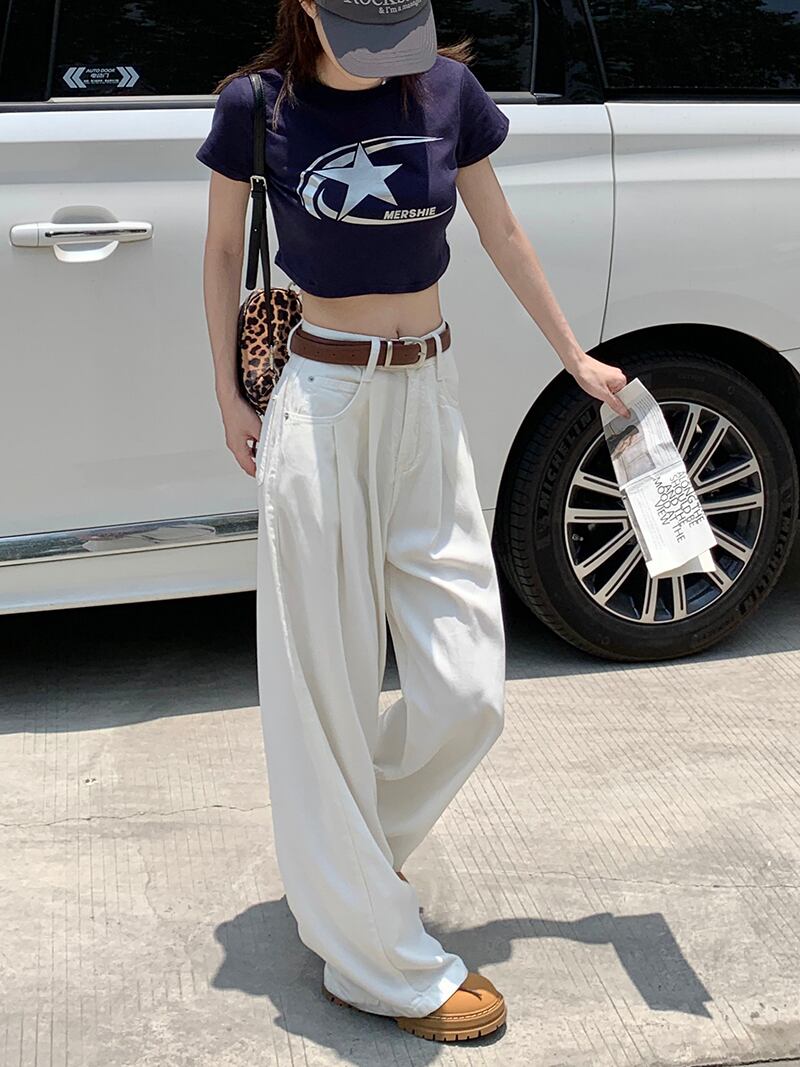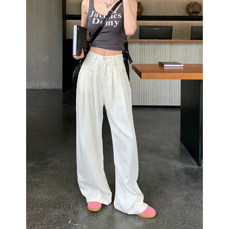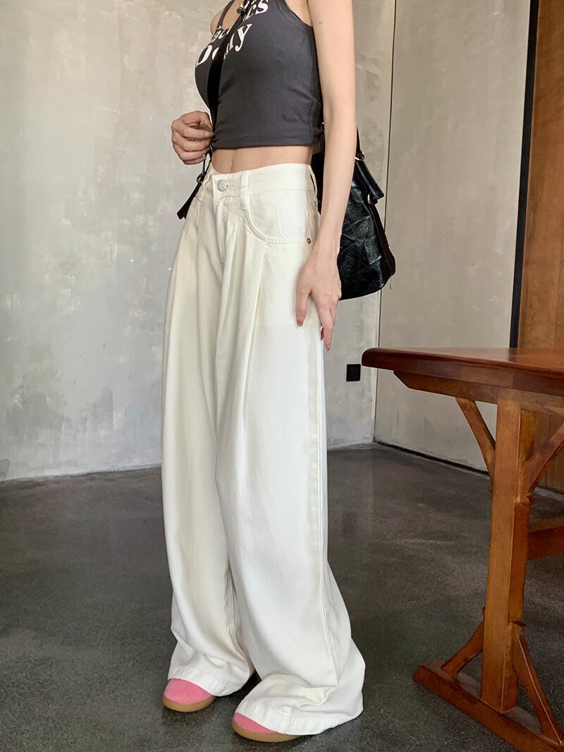 ハイウエストとワイドレッグで脚長効果も。