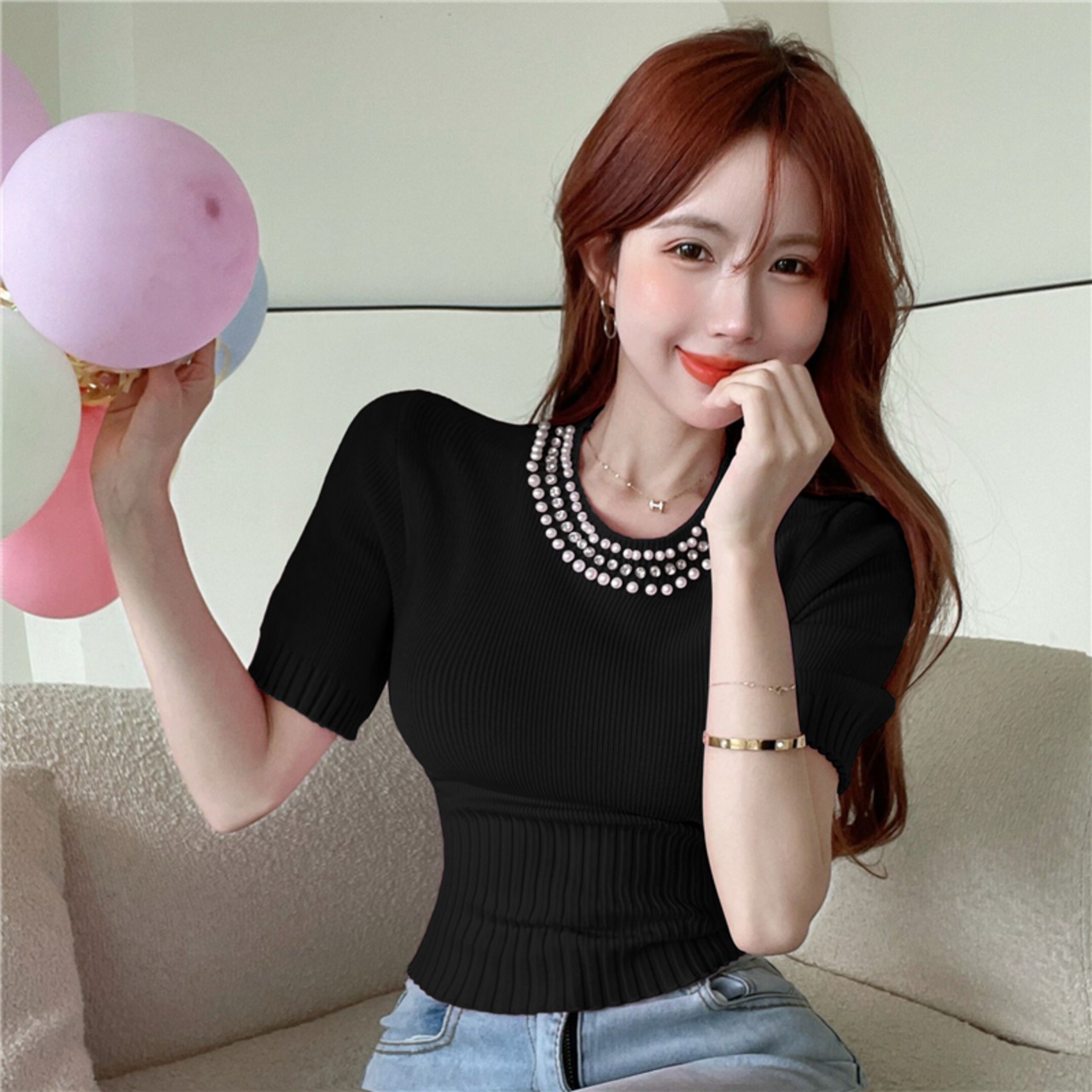 パールTシャツニット トップス 半袖 ニット パール Tシャツ ショート丈 サマーニット 夏 レディース ガーリー ママコーデ デート MH3638