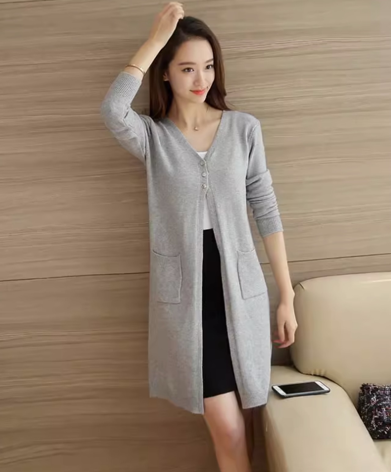 カーディガン ミモレ丈 レディース 春秋 長袖 無地 シンプル ポケット スリム オフィス シンプル ナチュラル カジュアル グレー ab2586