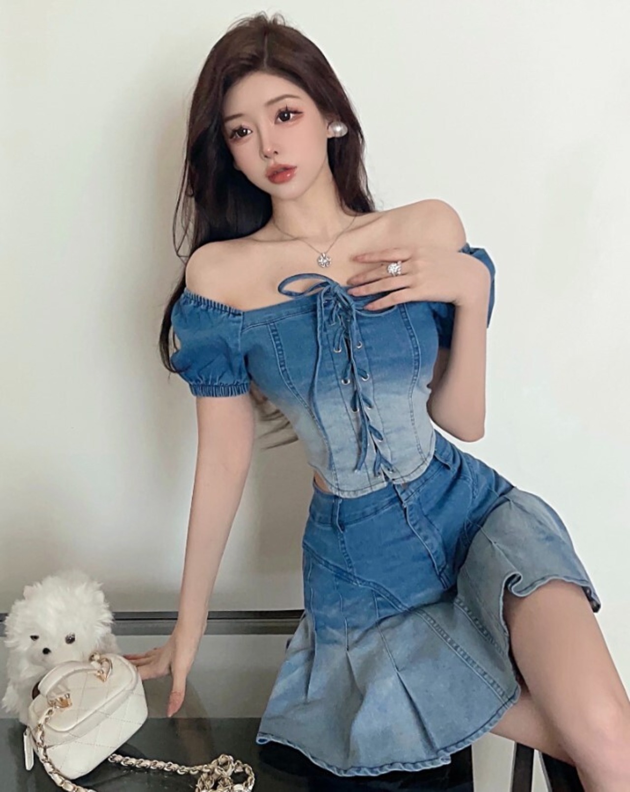 セットアップ ツーピース デニム レディース 2WAY オフショルダー ミニ丈 ショート丈 プリーツ ガーリー グラデーション カジュアル ブルー ab2600