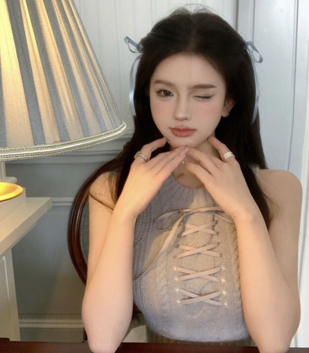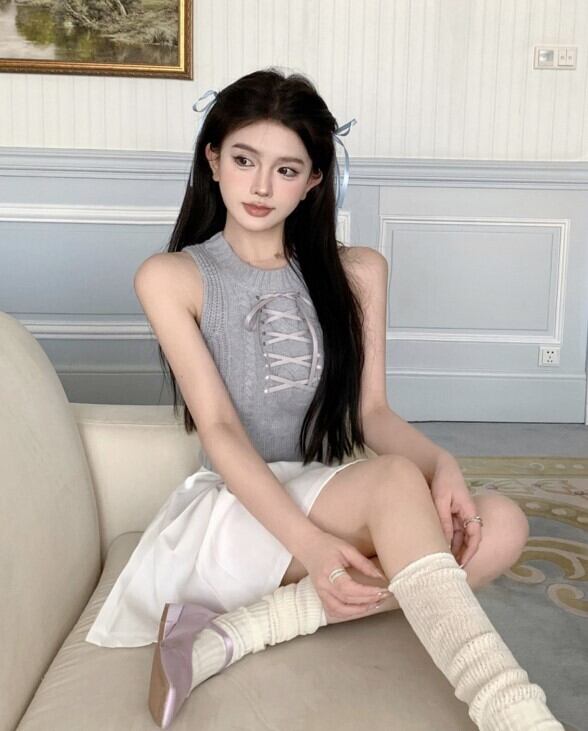 トップス サマーニット レディース ノースリーブ プルオーバー 春夏 リボン ラウンドネック ガーリー フェミニン ショート丈 グレー ab2603