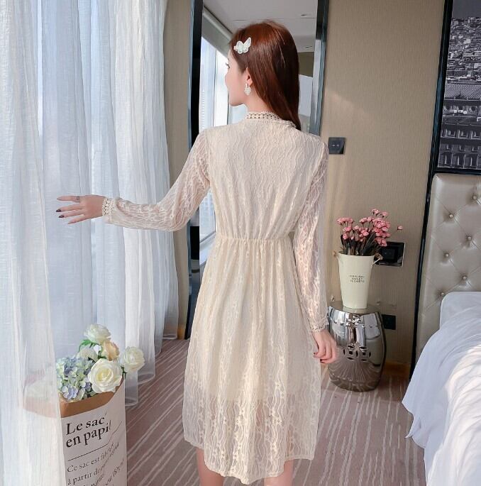 ワンピース 春夏 レースワンピ レディース レース 長袖 Aライン リボン ひざ丈 フェミニン 清楚 プチプラ ベージュ ab2608