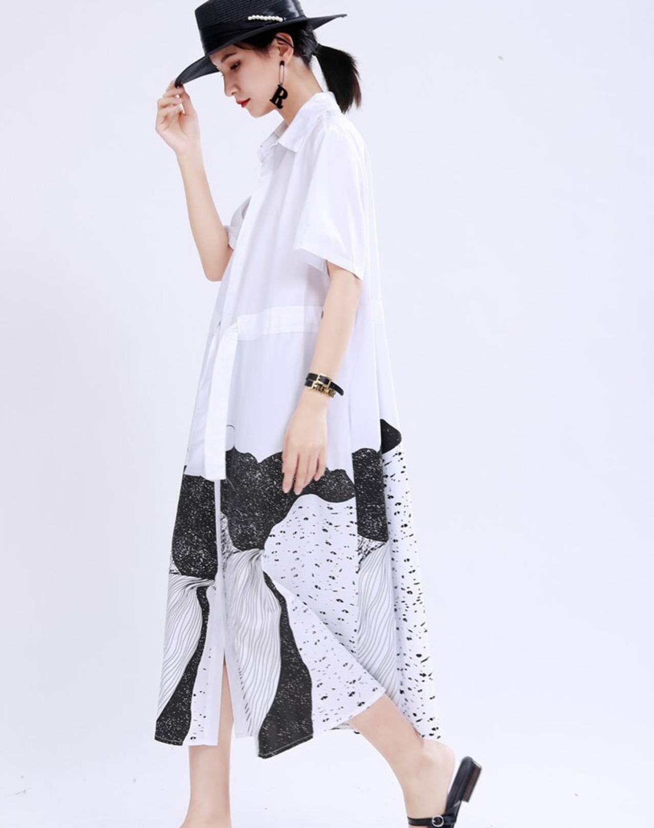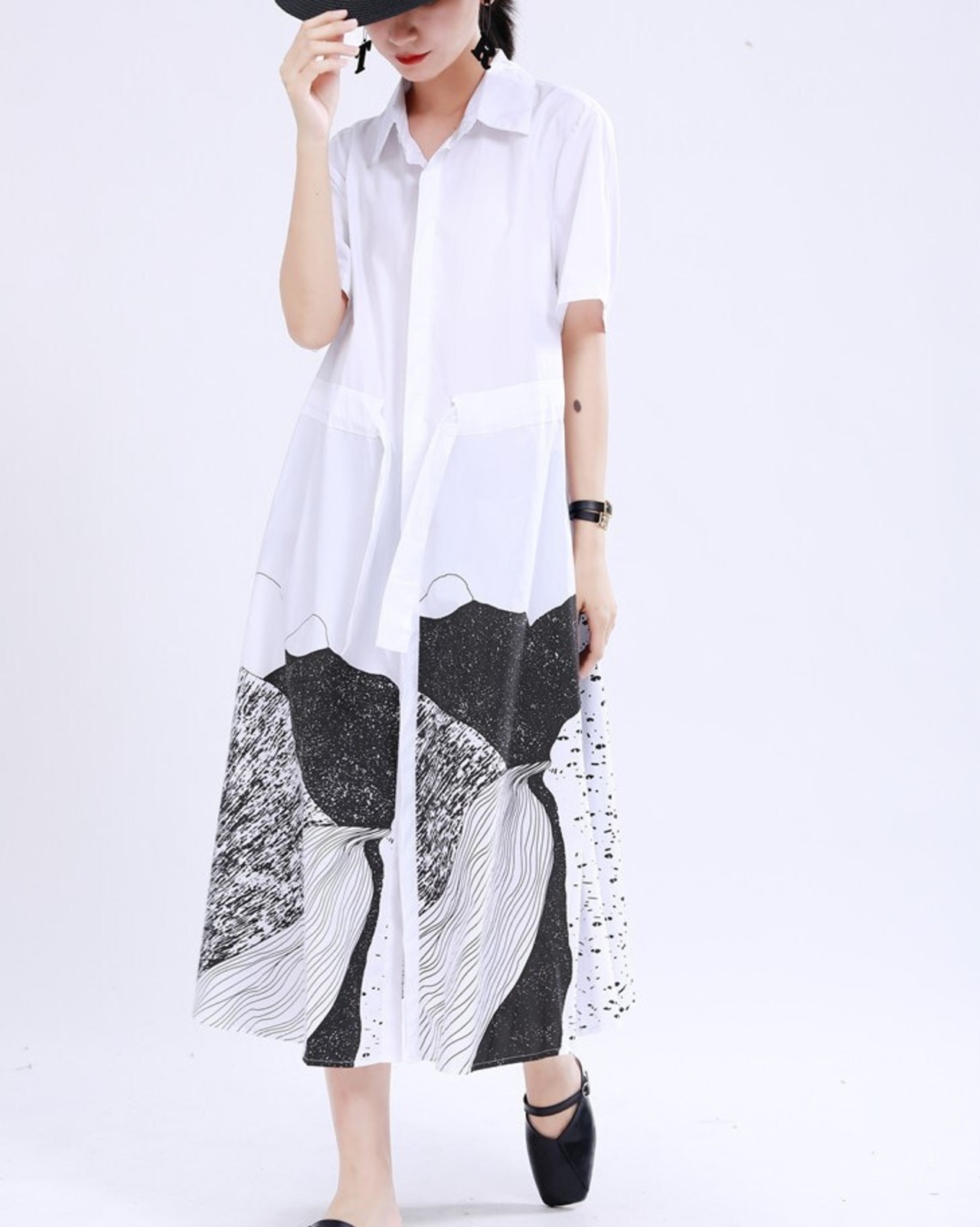 ワンピース ゆったり レディース 春夏 ロング丈 大きいサイズ シャツワンピ 幾何学 レトロ 半袖 ハイウエスト ガーリー ホワイト ab2613