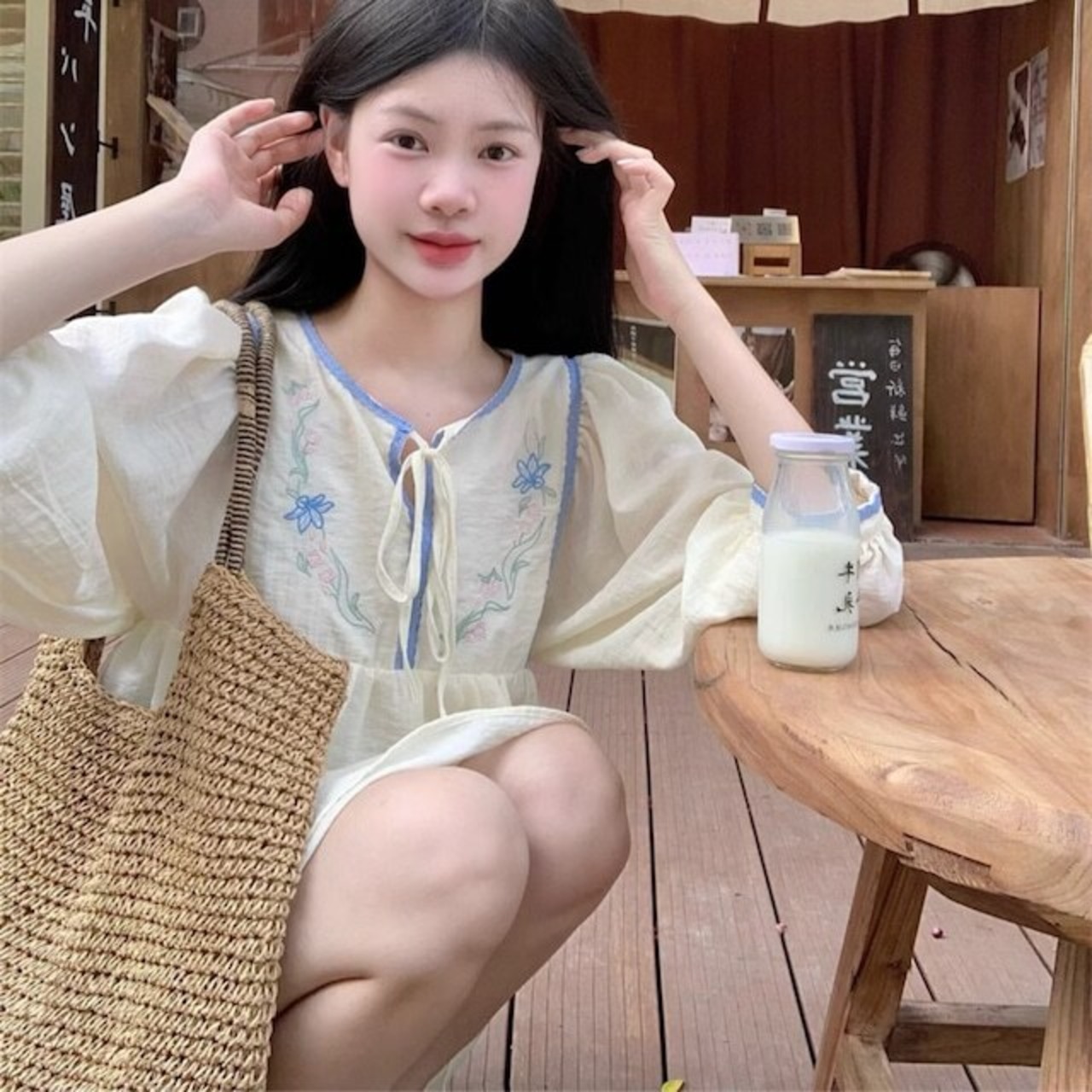 7分袖ワンピース ワンピース 7分袖 花刺繍 ミニ丈 ランタンスリーブ フェミニン 夏 レディース 大人可愛い ママコーデ デート お出かけ MH3645