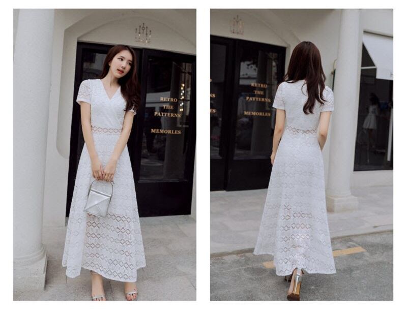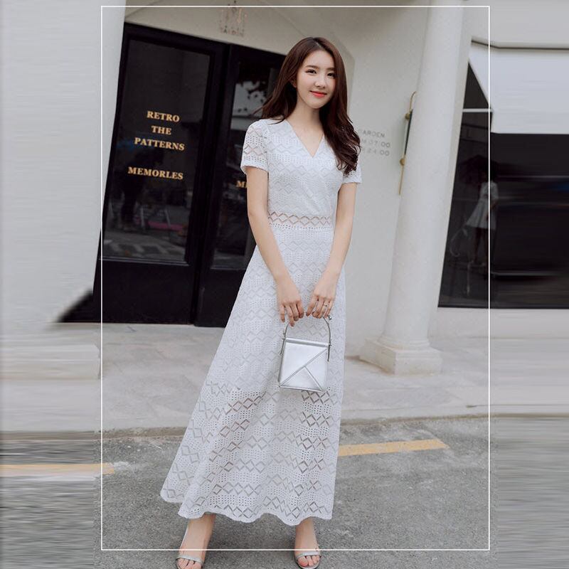 ロングワンピース ワンピース ロング丈 半袖 レース Vネック 透け感 夏 レディース フェミニン お出かけ MH3658