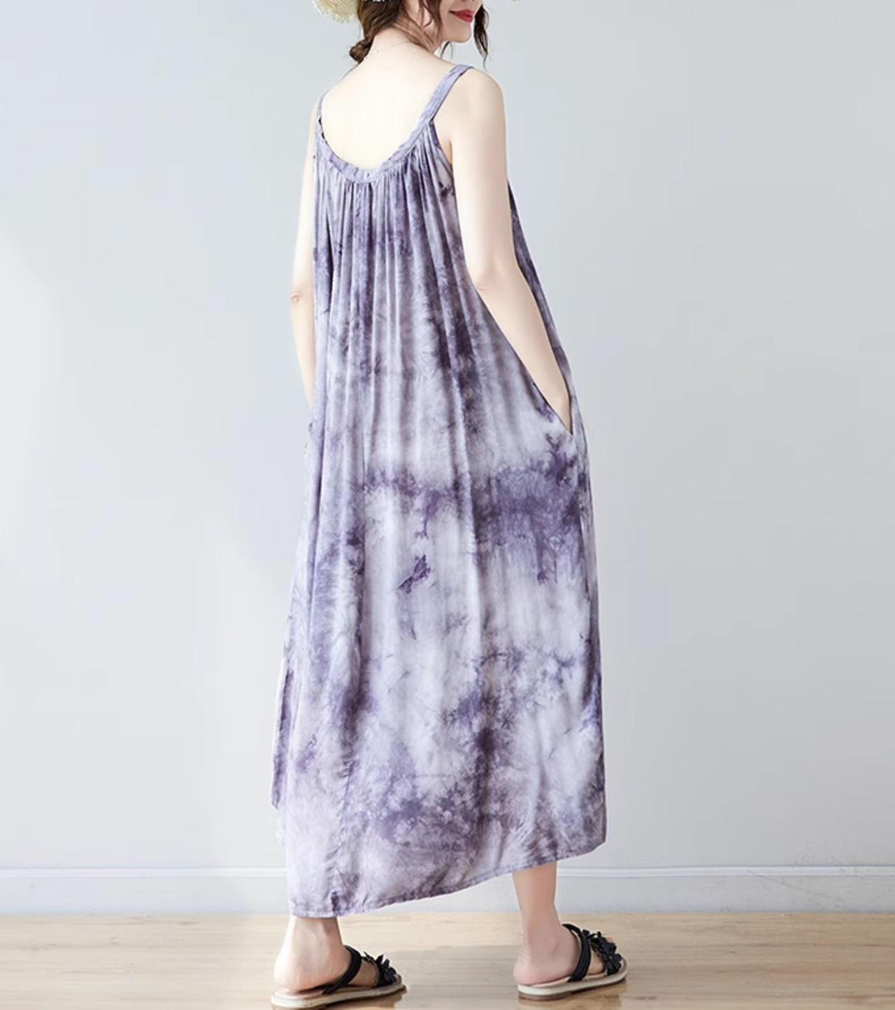 ワンピース キャミワンピ リゾートワンピ 夏ワンピ レディース 春夏 ノースリーブ 海 プール 旅行 ロング丈 染物風 ゆったり プリーツ パープル ab2621