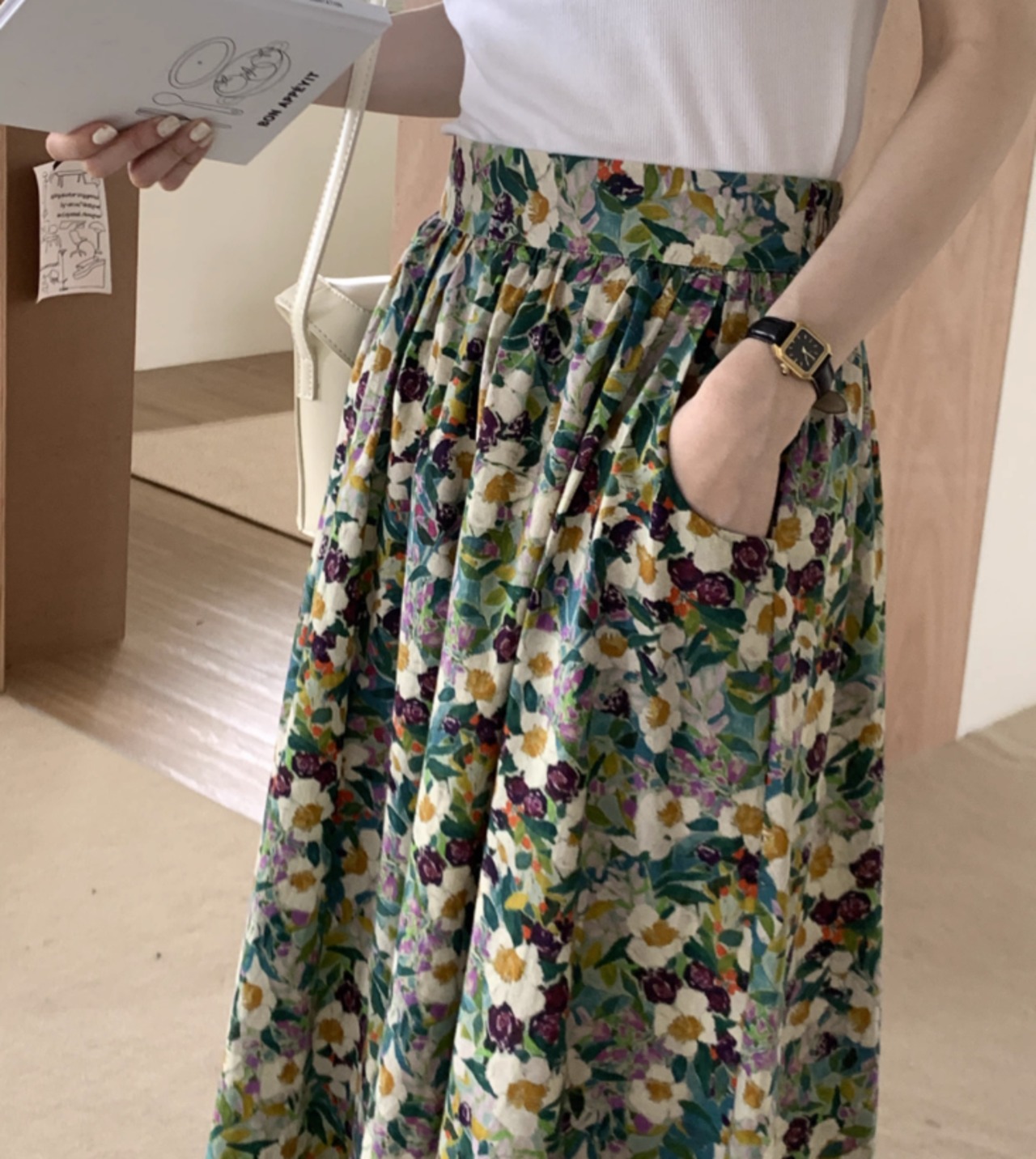 スカート レディース 春夏 ミモレ丈 花柄 フレンチ レトロ ハイウエスト Aライン ゴムウエスト ガーリー オフィス ab2631
