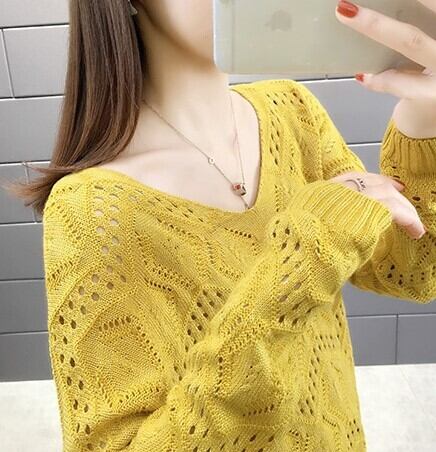 セーター 春秋 レディース ニット サマーセーター 長袖 Vネック ゆったり 透け模様 オフィス イエロー ab2634