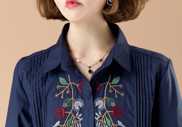 シャツ ブラウス レディース 春夏 長袖 ロング丈 花刺繍 オフィス ママコーデ カジュアル 大きいサイズ ブルー ab1638