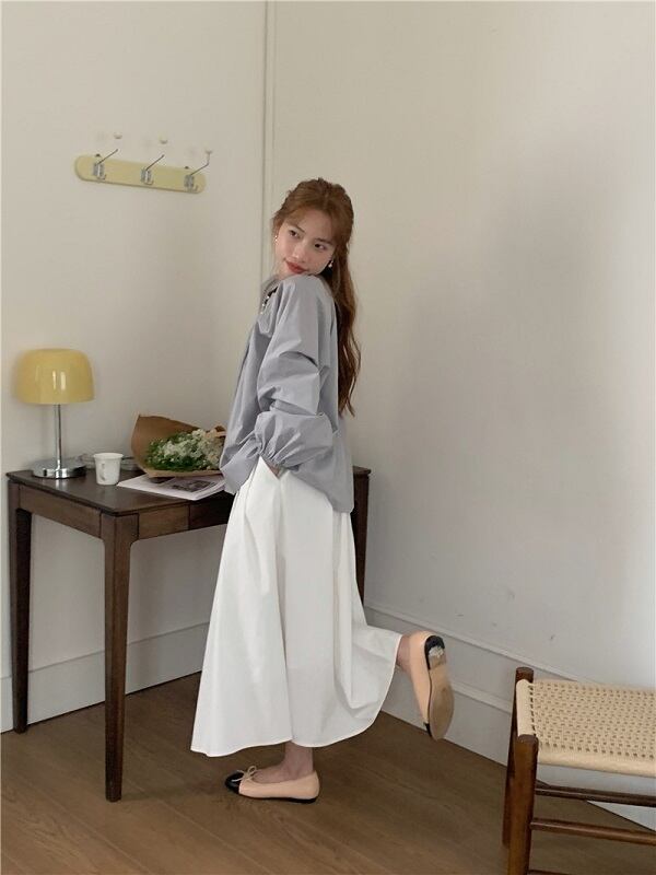 ノーカラーブラウス トップス 長袖 ノーカラー ブラウス ブルー パールボタン シック きれいめ 秋 レディース 通勤 オフィスコーデ MH3695