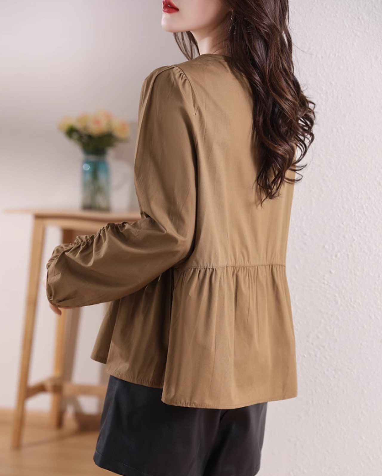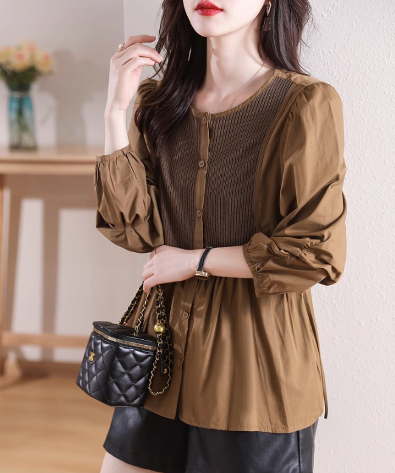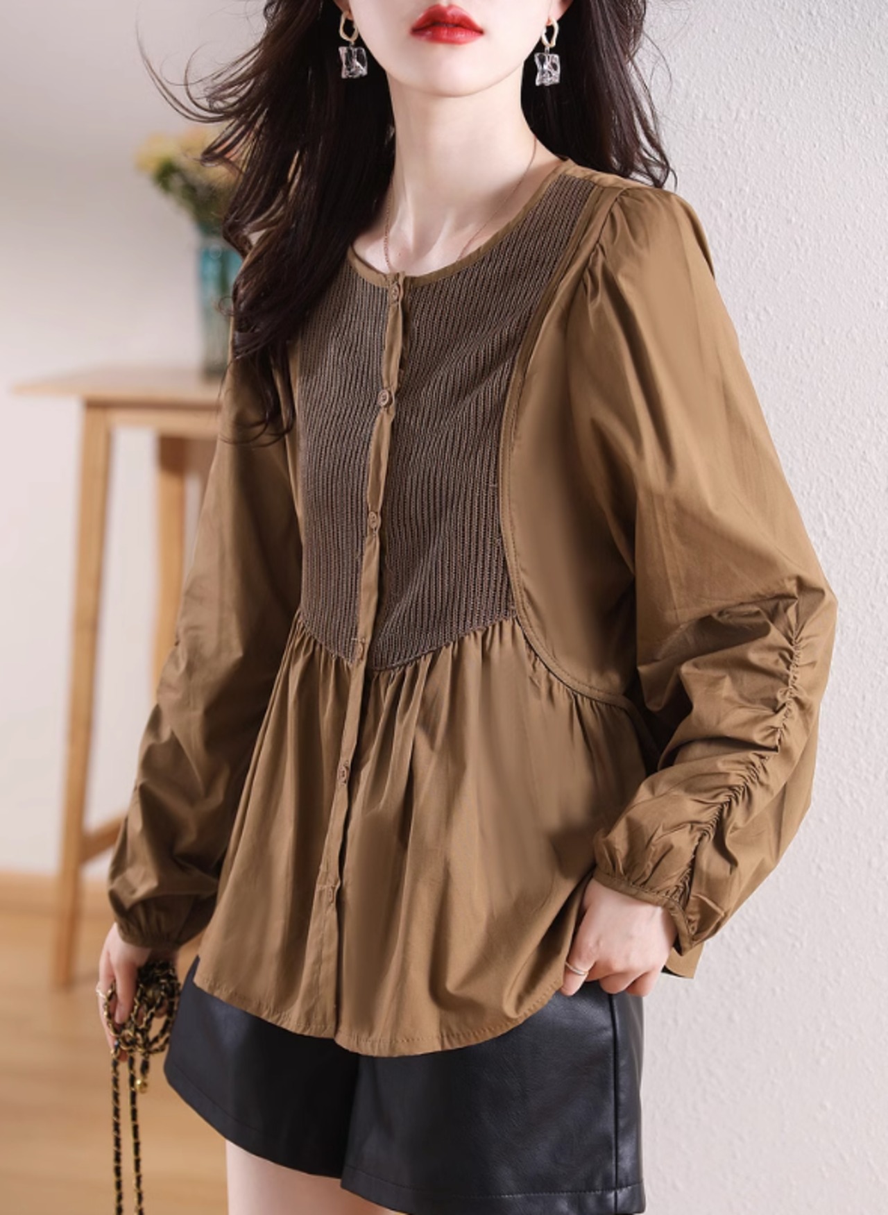 シャツ ブラウス トップス ラウンドネック チュニック風 レディース 秋冬 長袖 異素材MIX ニット 無地 オフィス ブラウン ab2647