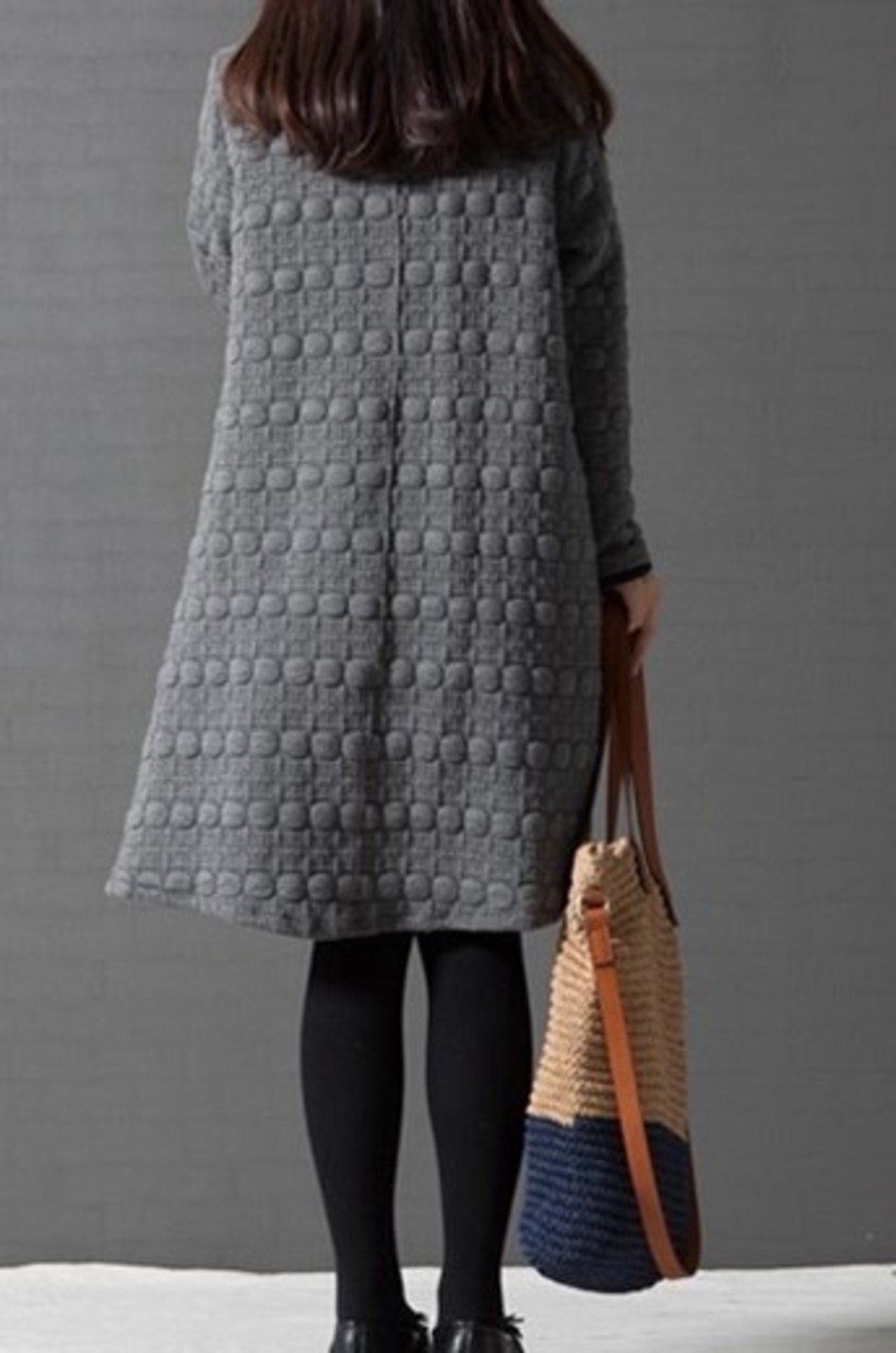ワンピース チュニック ひざ丈 秋冬 厚め ゆったり ハイネック 長袖 エンボス レディース グレー ab2649