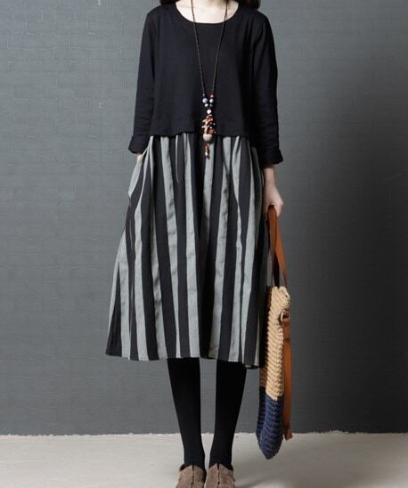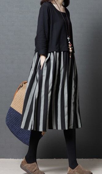 ワンピース バイカラー ストライプ ゆったり ふんわり カジュアル 森ガール リネン ロング丈 ラウンドネック シーズンレス ブラック ab2651
