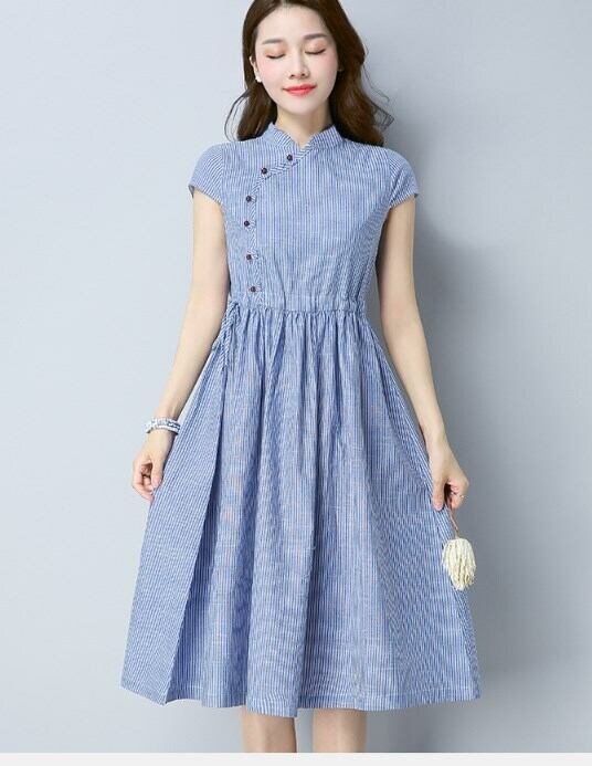 ワンピース 春夏 チャイナ風ワンピ ハイネック レトロ 大きいサイズ ふんわり ミディアム丈 半袖 エスニック ナチュラル ガーリー ブルー ab2708