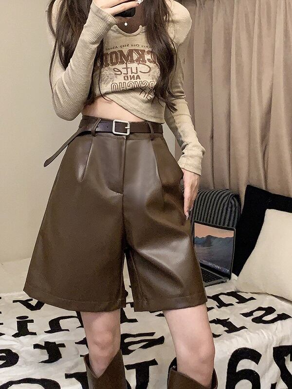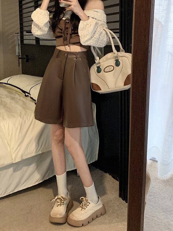 ハーフパンツ パンツ ハーフ PUレザー ハイウエスト ブラウン 秋 冬 レディース きれいめ おしゃれ デート MH3703