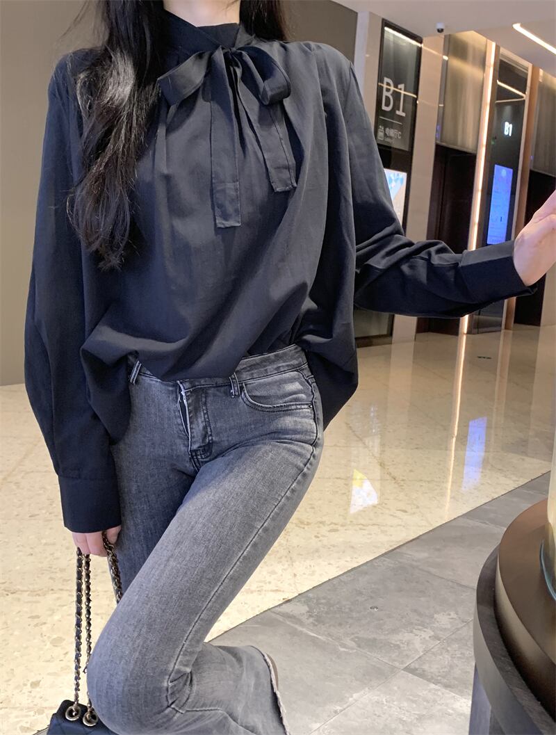 長袖のリボンブラウス。