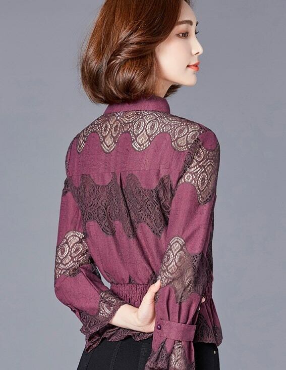 シャツ ブラウス レディース レース フリル シースルー ハイネック 大きいサイズ エレガント パープル ab2716