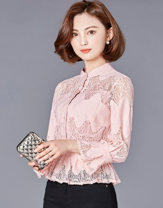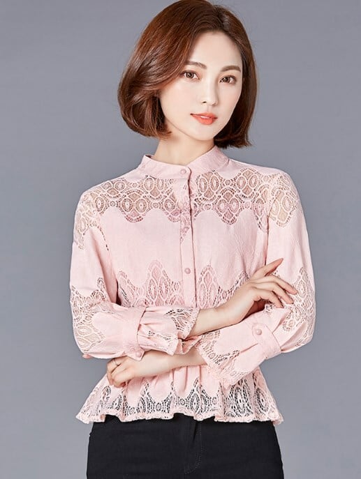 シャツ ブラウス レディース レース フリル シースルー ハイネック 大きいサイズ エレガント ピンク ab2717