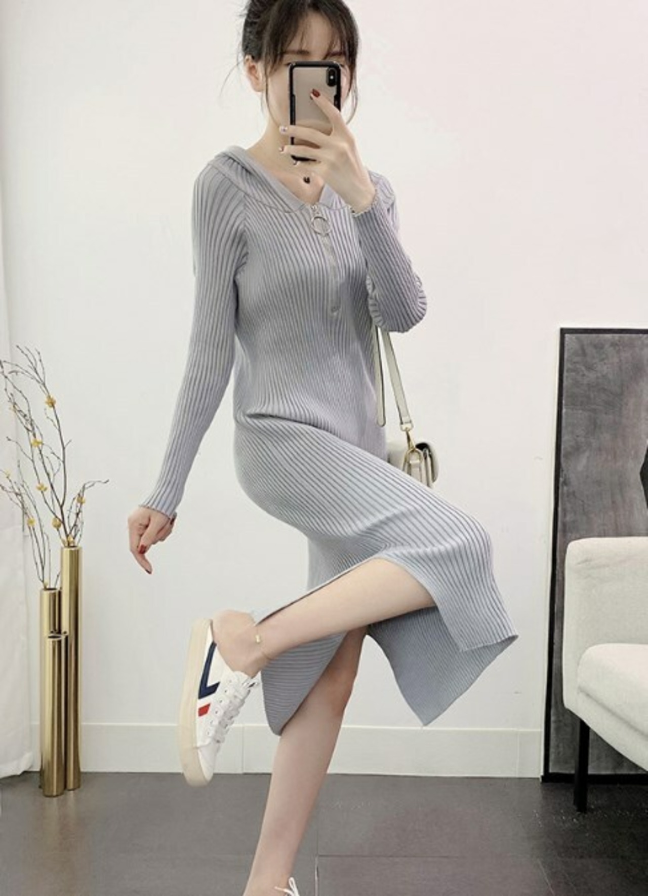 ワンピース ニットワンピース ミモレ丈 ニット レディース 秋冬 スリット 無地 フード グレー ab2720