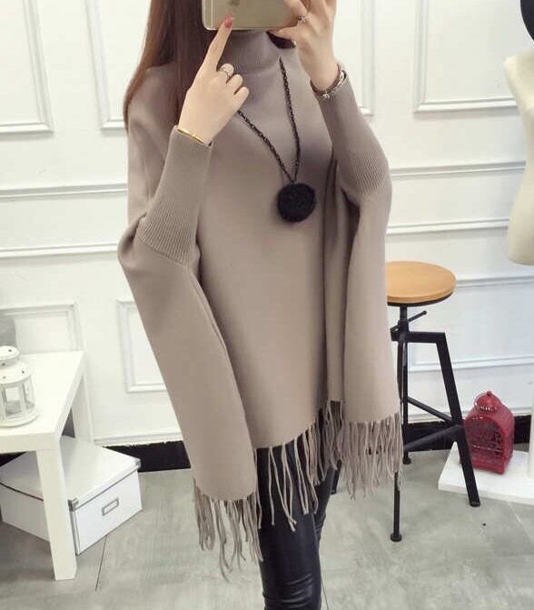 セーター ニット レディース 秋冬 ポンチョ風 フリンジ 体型カバー タートルネック カーキ ab2722