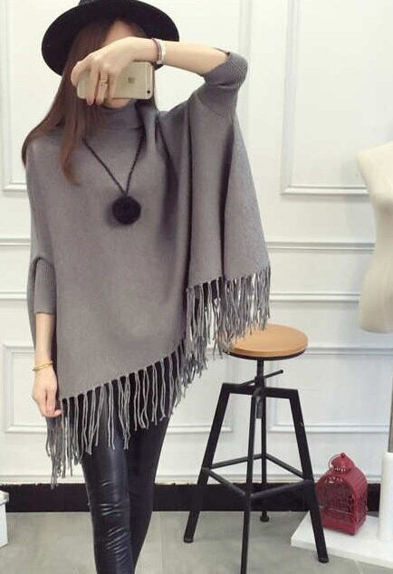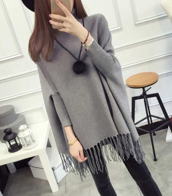 セーター ニット レディース 秋冬 ポンチョ風 フリンジ 体型カバー タートルネック グレー ab2723