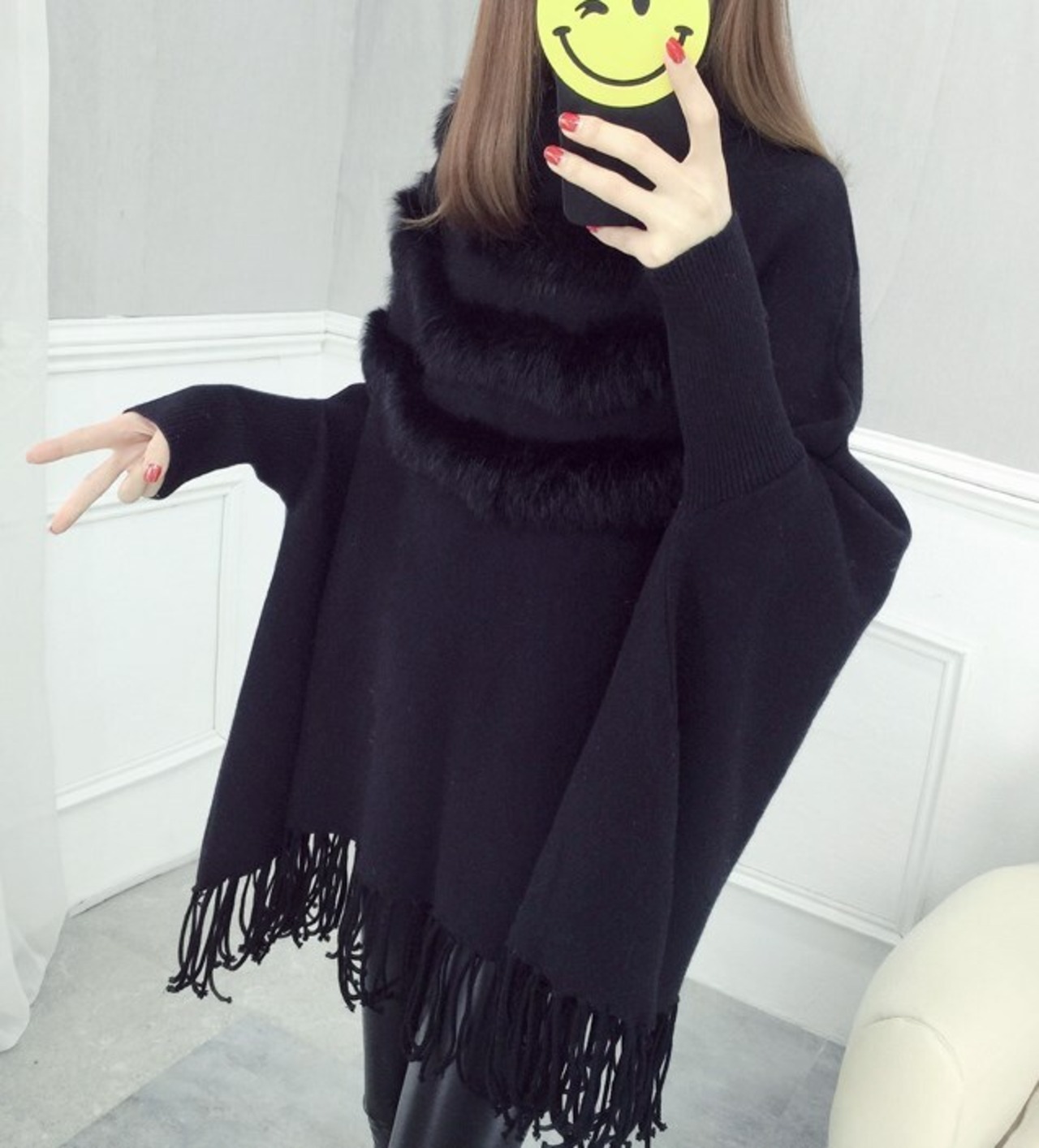 プルオーバー ニット セーター ポンチョ ファー レディース 秋冬 フリンジ エレガント ブラック ab2724