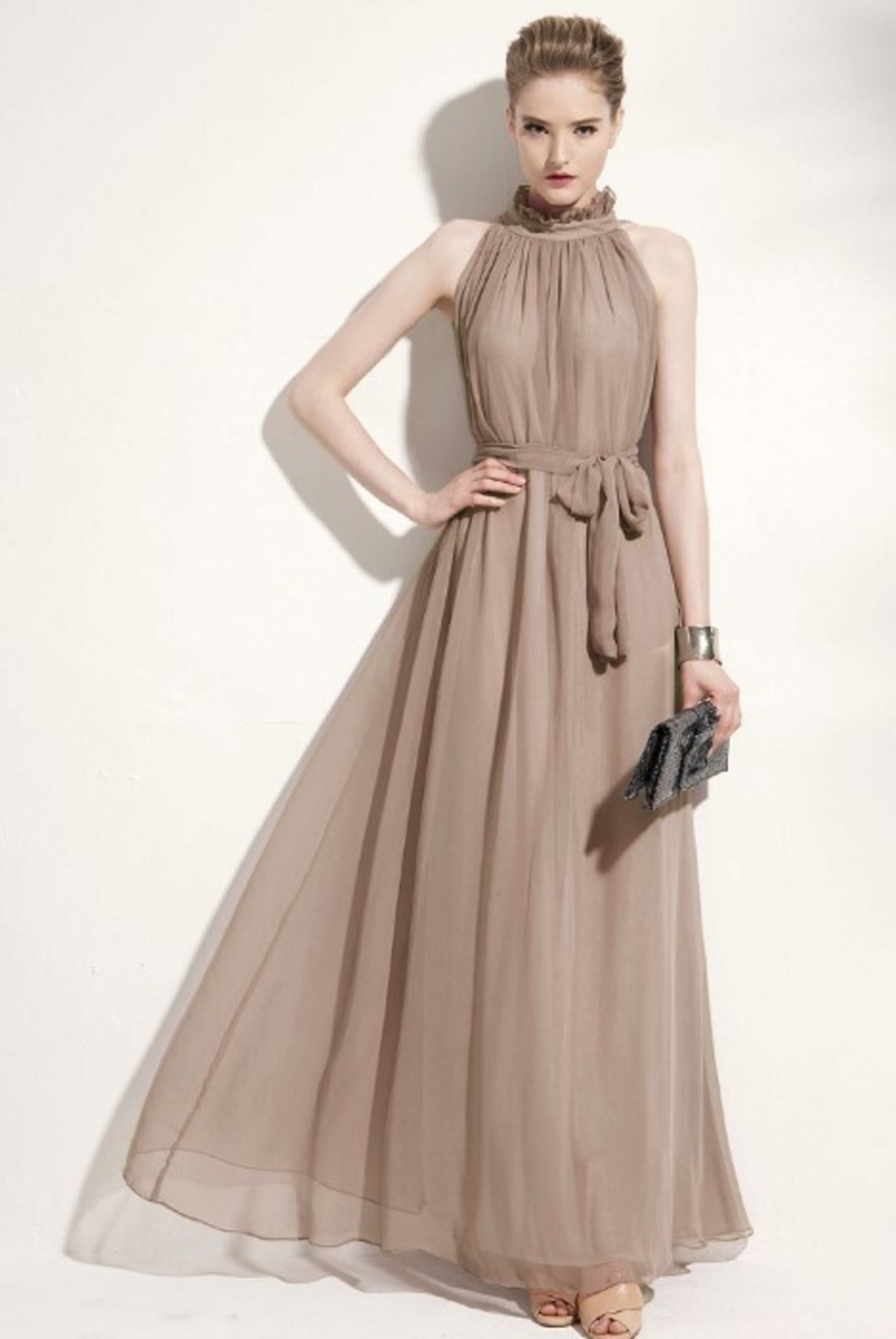 ワンピース ドレス シフォンワンピ レディース 春夏 ロング丈 パーティー 結婚式 二次会 お呼ばれ ハイネック ノースリーブ エレガント カーキ ab2746