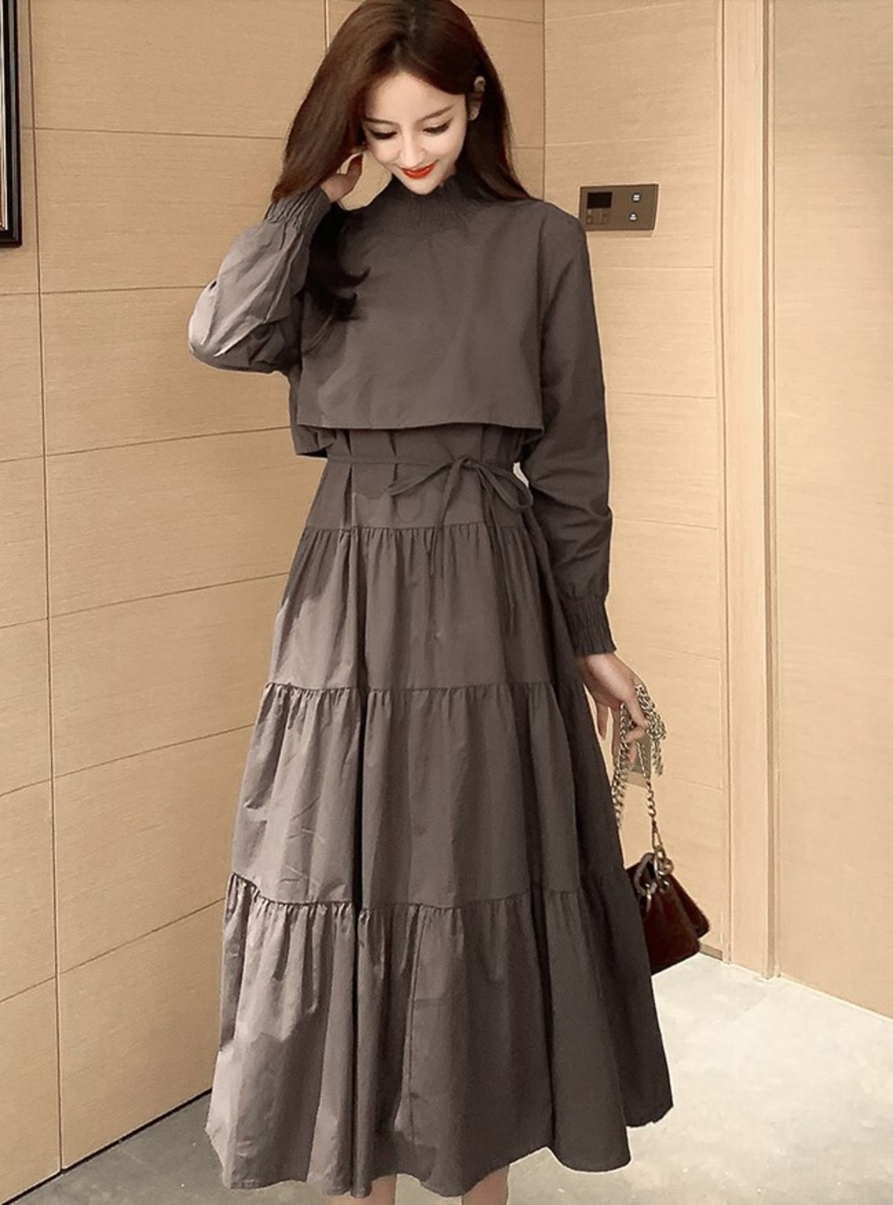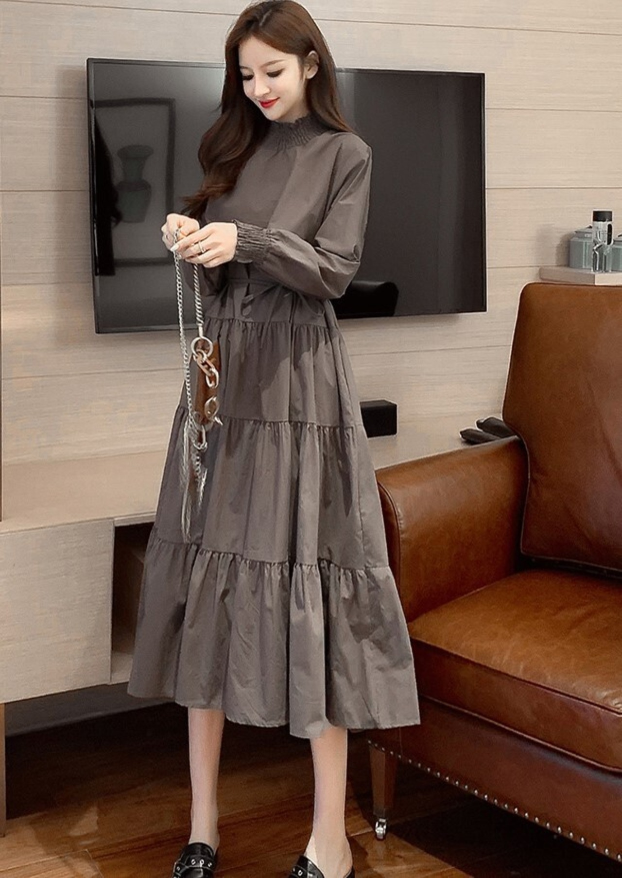 ワンピース レディース 秋冬 フレンチ ミモレ丈 ハイウエスト レトロ 長袖 ハイネック ガーリー プチプラ グレー ab2757