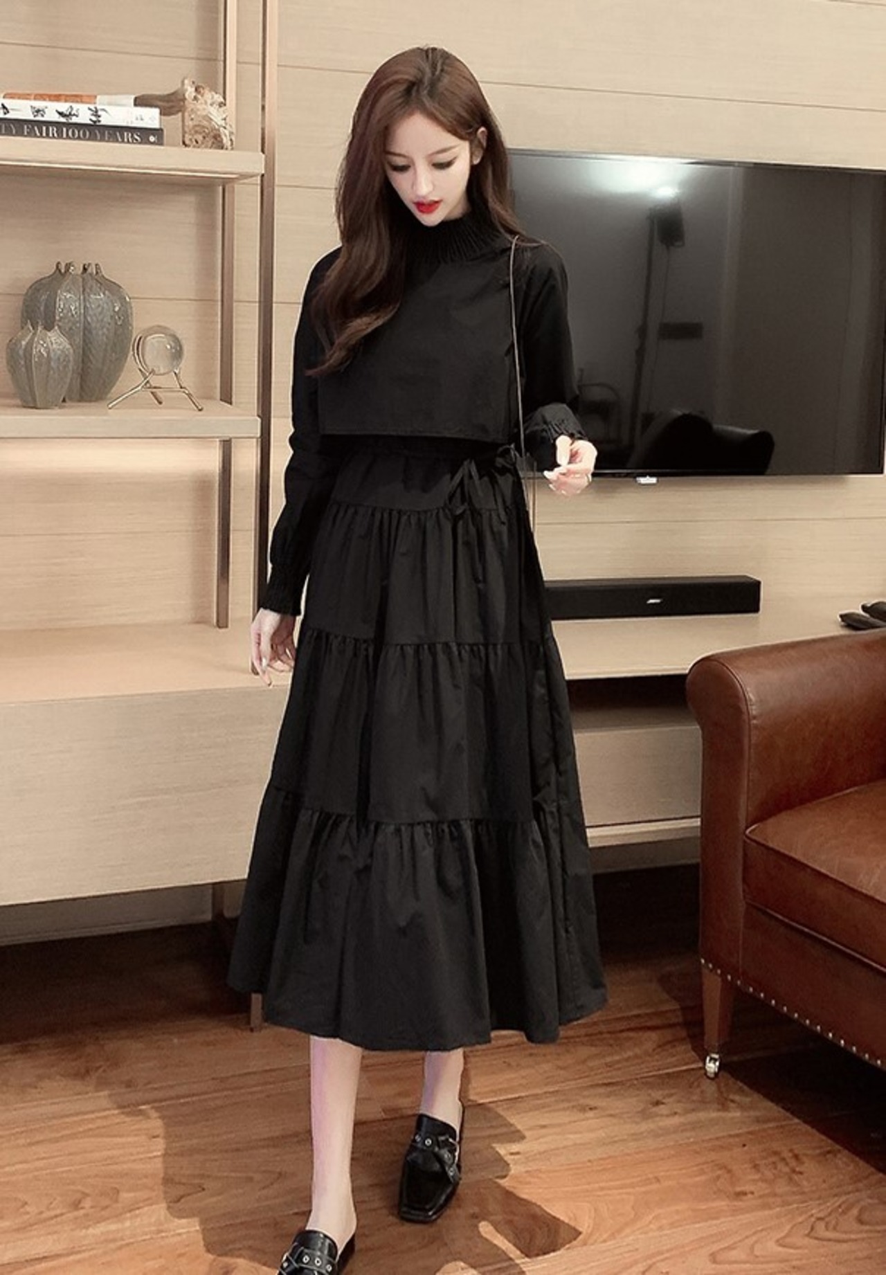 ワンピース レディース 秋冬 フレンチ ミモレ丈 ハイウエスト レトロ 長袖 ハイネック ガーリー プチプラ ブラック ab2758