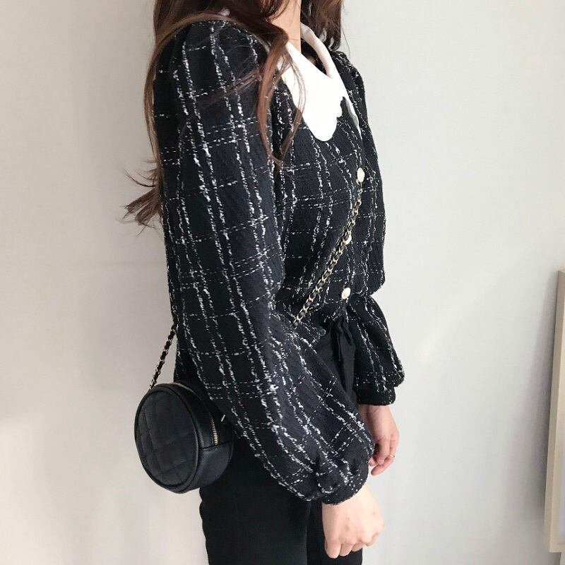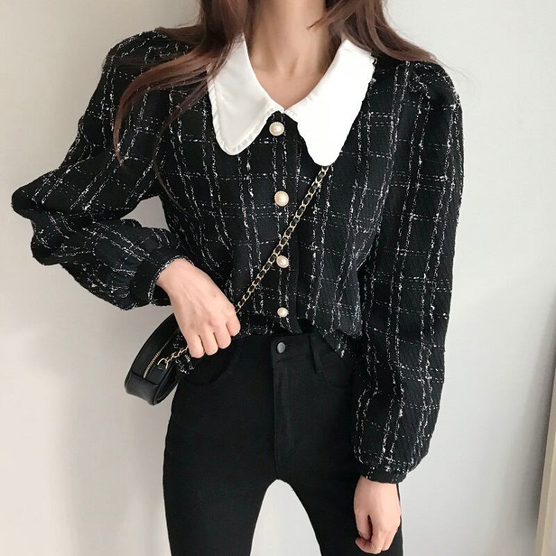 パールボタントップス トップス 長袖 パールボタン 丸襟 襟付き レディース シック 大人可愛い ブラック デート MH3747