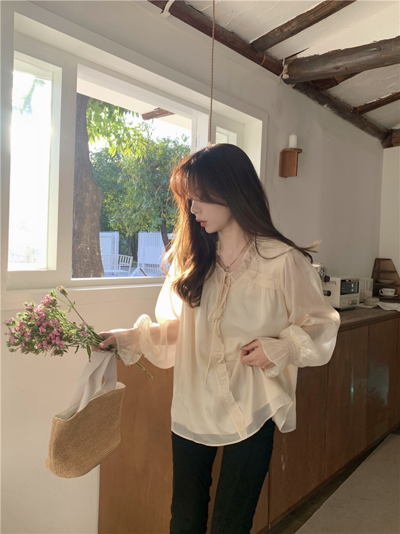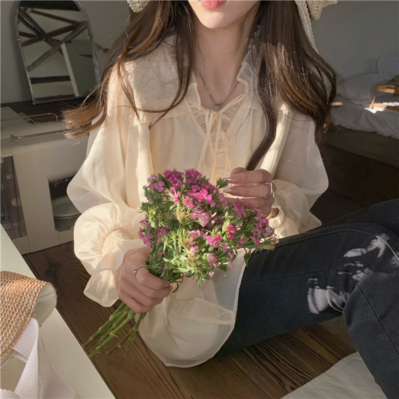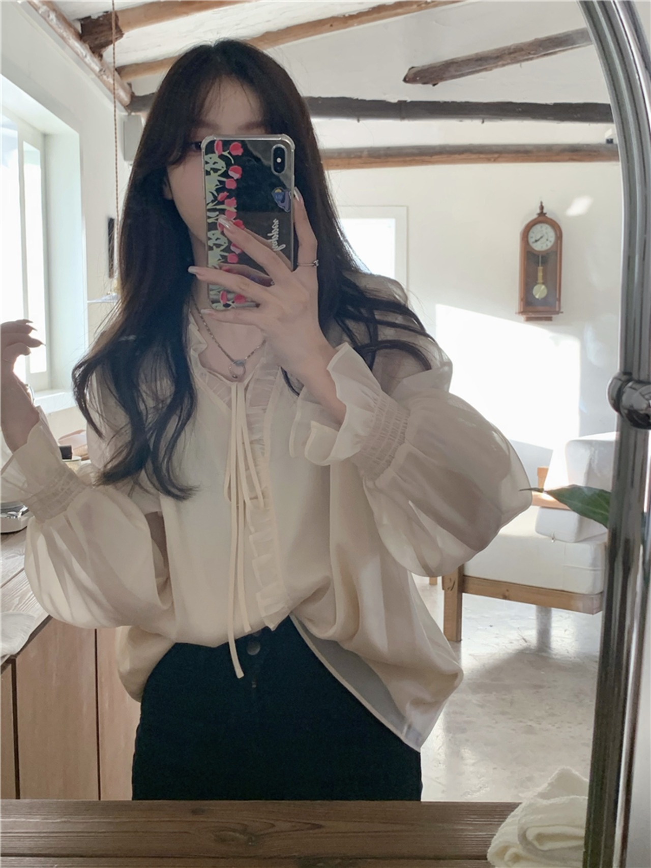Vネックフリルブラウス トップス ブラウス レディース 長袖 Vネック フリル ゆったり 大きいサイズ サイズ豊富 MH3760